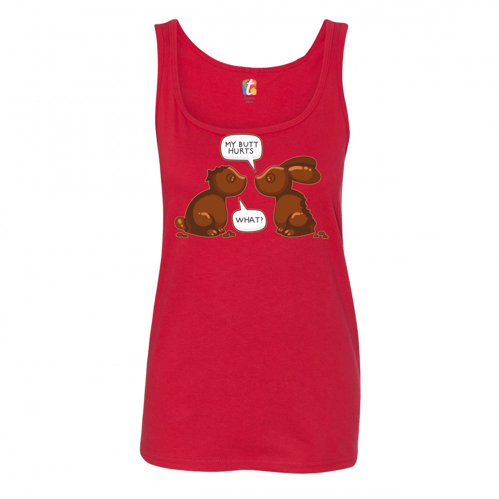 A funny print featuring two bitten chocolate rabbits. The one with a bitten butt says: "my butt hurts", and the one with bitten ears replies: "what?". A great gift for a religious person for Easter, Christmas or any other religious holiday.
