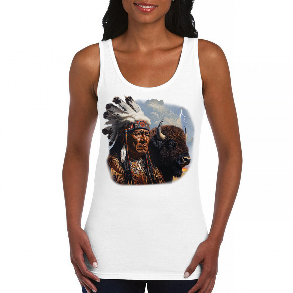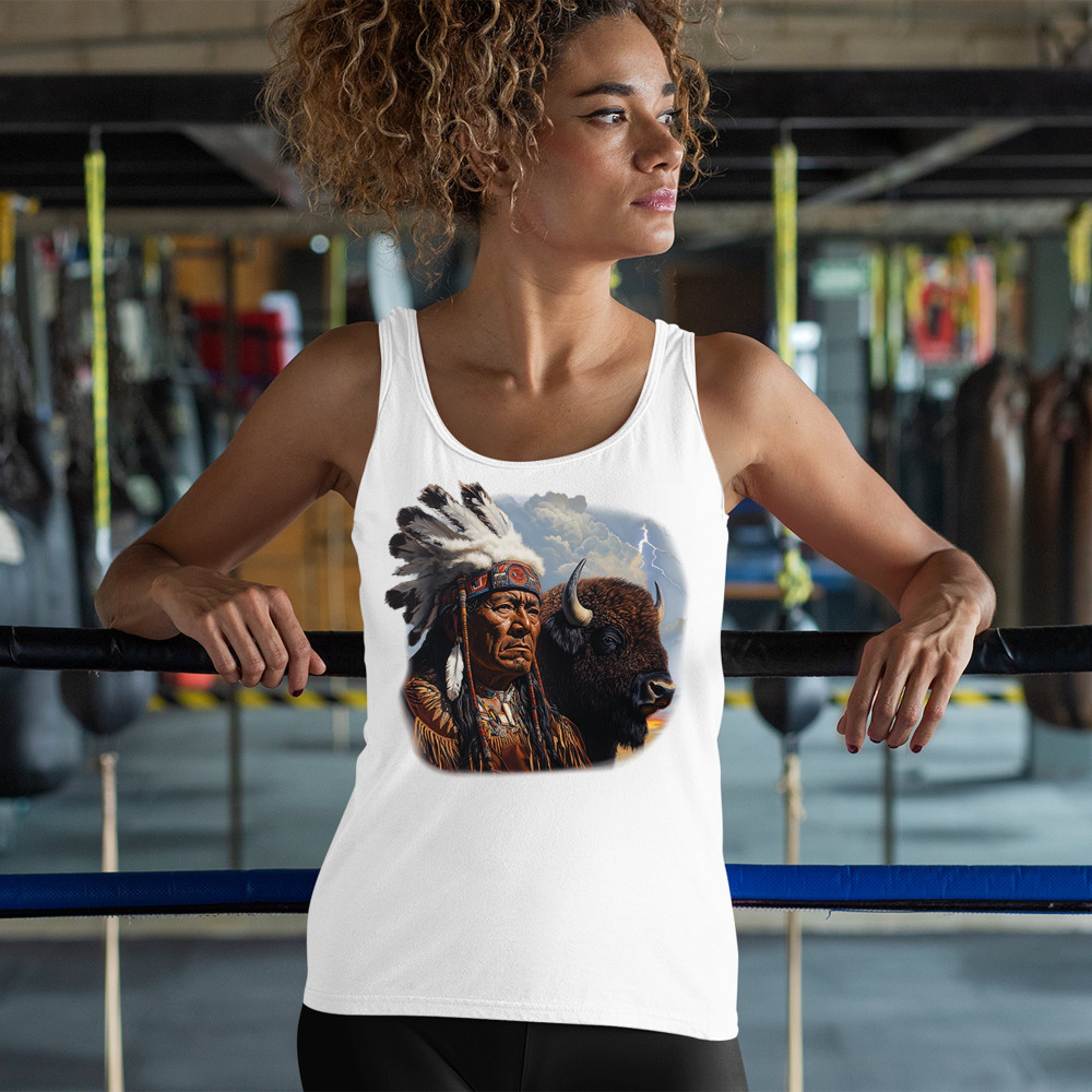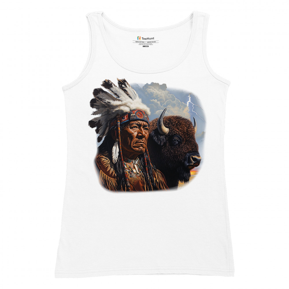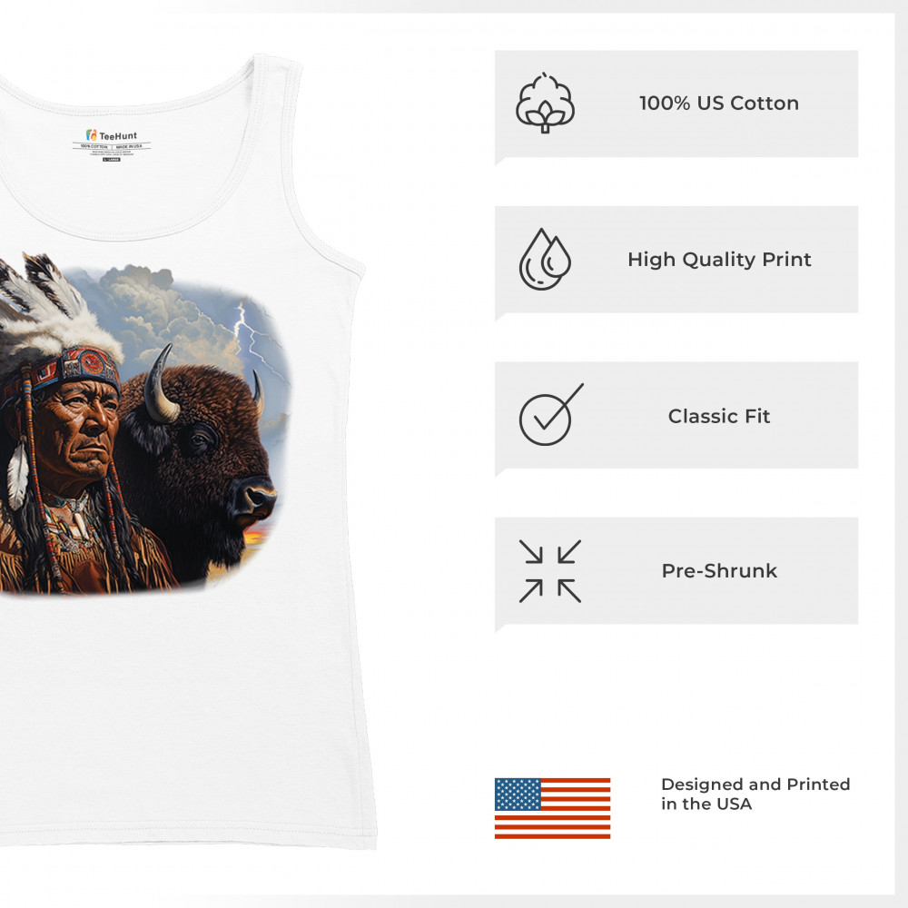 This powerful design features a Native American elder in traditional dress and feathered headdress beside a noble bison. Framed by a stormy sky and lightning, the art symbolizes tribal pride, spiritual harmony, ancestral strength, and a deep connection to nature’s raw energy.