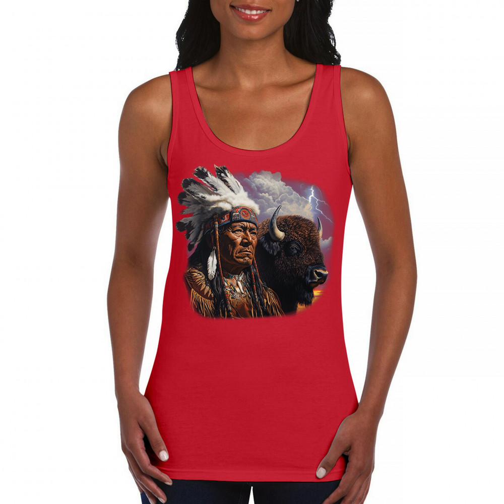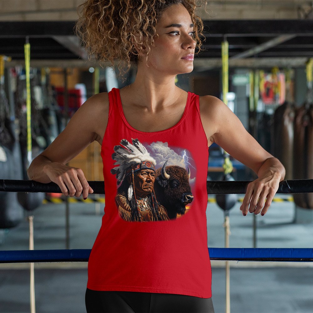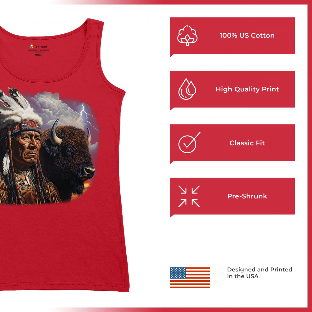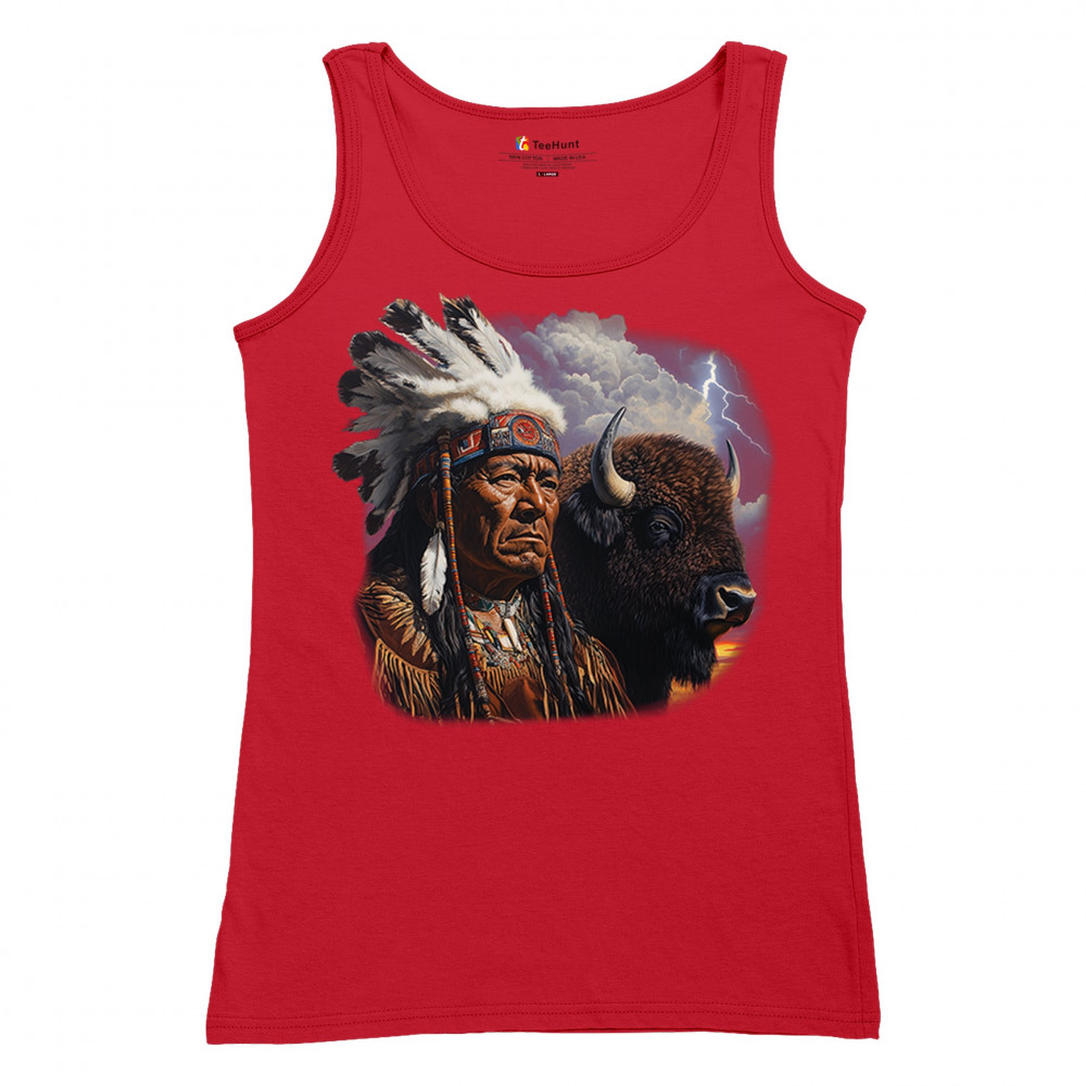 This powerful design features a Native American elder in traditional dress and feathered headdress beside a noble bison. Framed by a stormy sky and lightning, the art symbolizes tribal pride, spiritual harmony, ancestral strength, and a deep connection to nature’s raw energy.