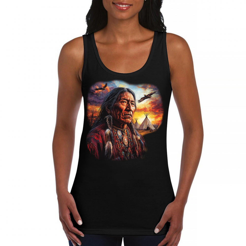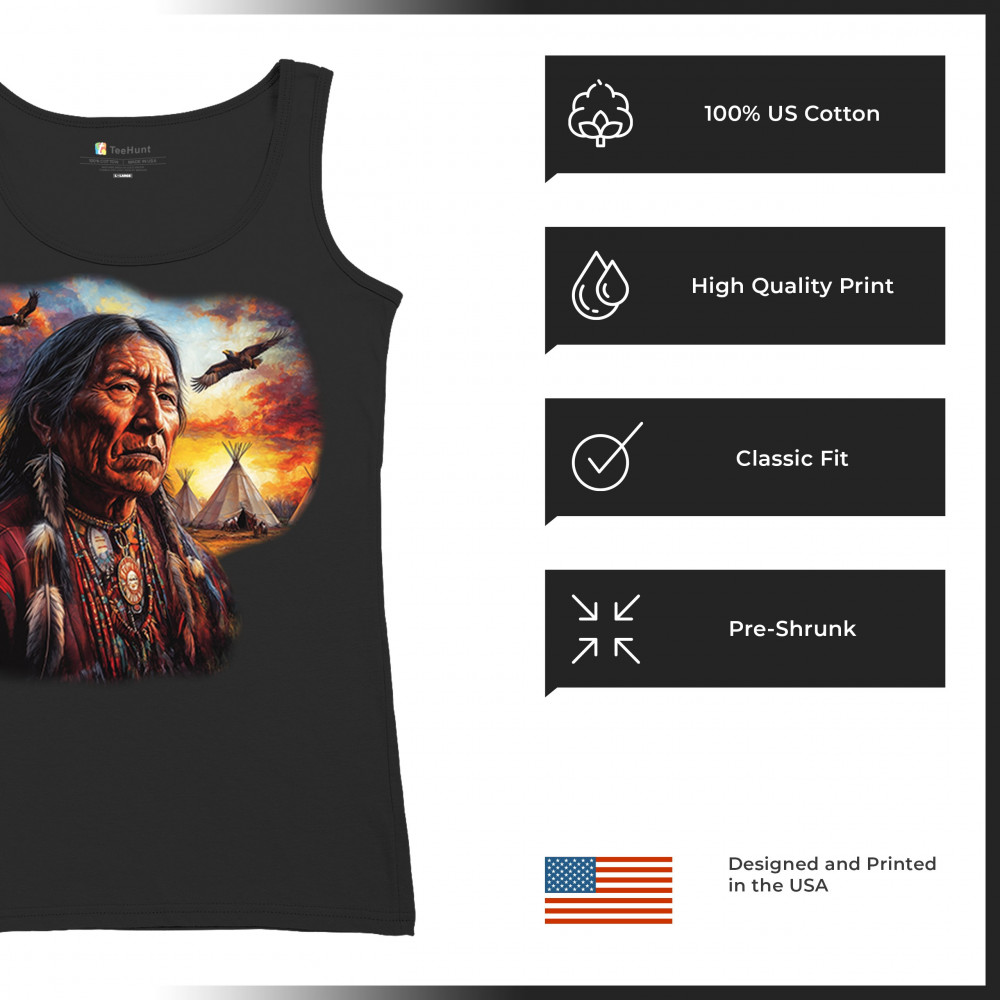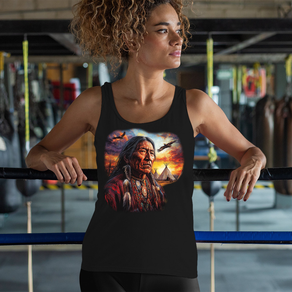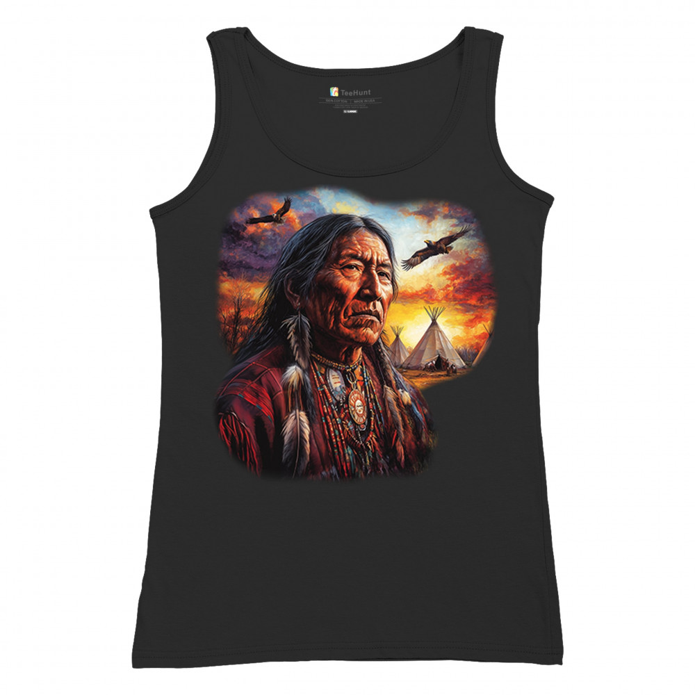 This vivid artwork features a Native American elder in traditional feathered attire, set before a blazing sunset with soaring eagles and peaceful teepees. The scene symbolizes strength, heritage, and spiritual wisdom. A heartfelt tribute to tribal pride, ancestral legacy, and cultural connection to land.