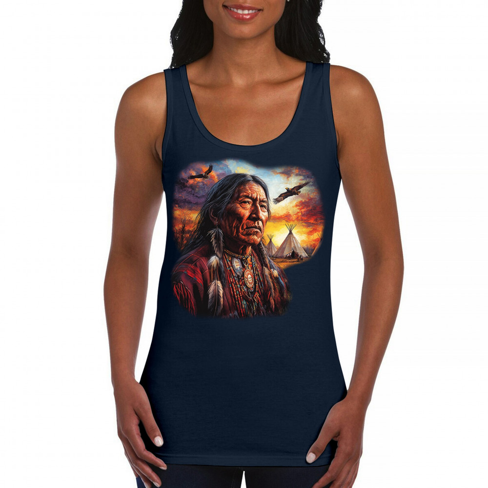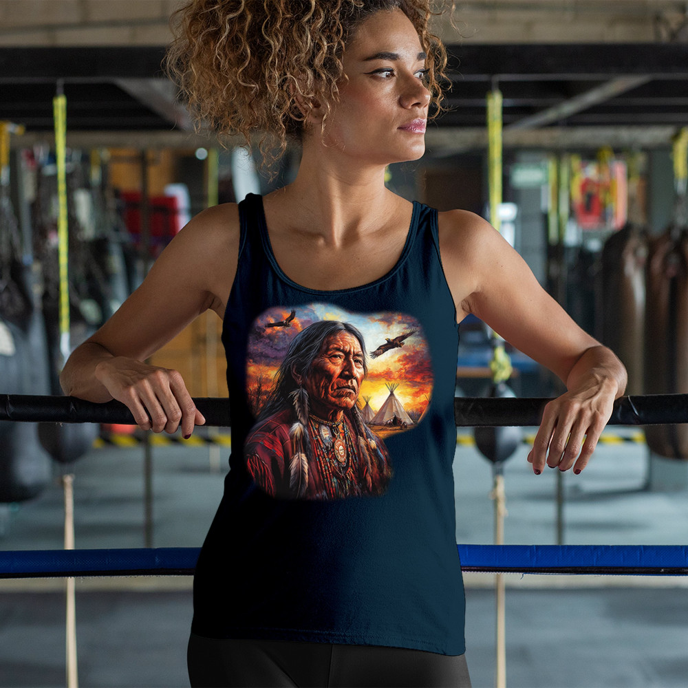 This vivid artwork features a Native American elder in traditional feathered attire, set before a blazing sunset with soaring eagles and peaceful teepees. The scene symbolizes strength, heritage, and spiritual wisdom. A heartfelt tribute to tribal pride, ancestral legacy, and cultural connection to land.