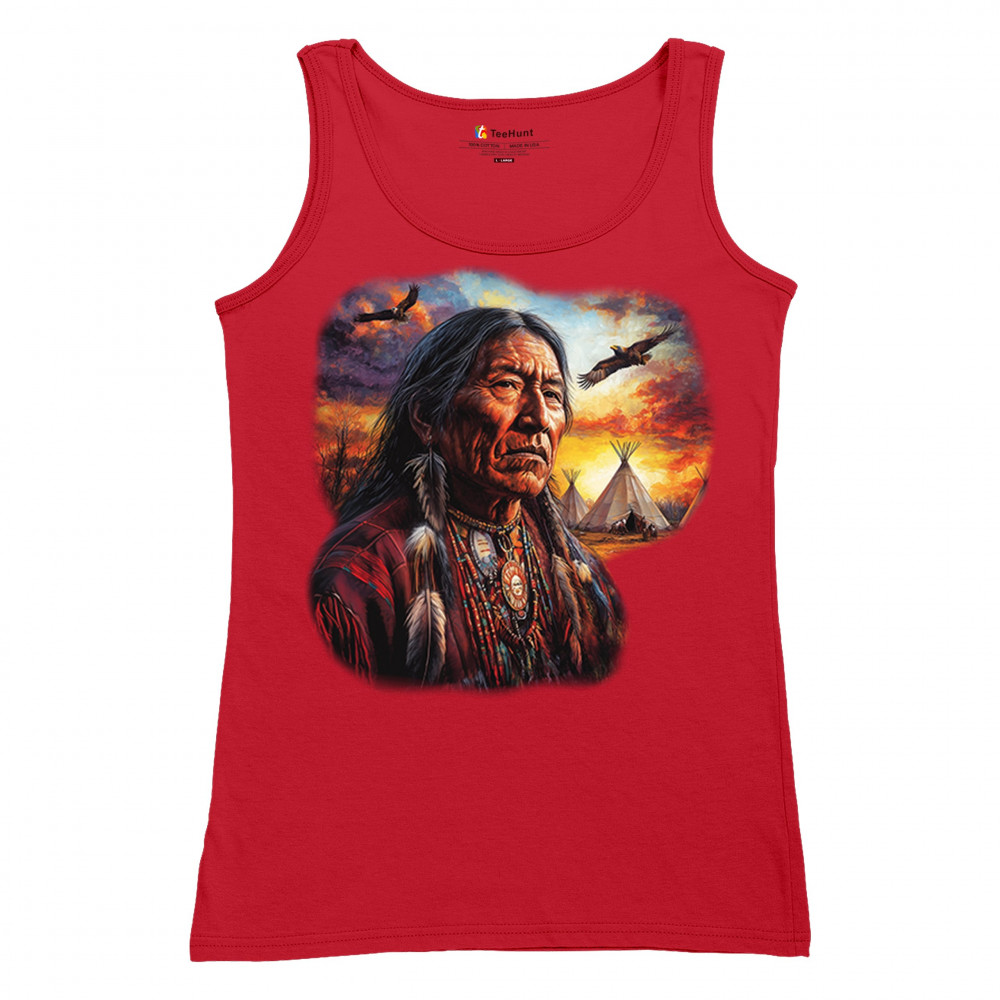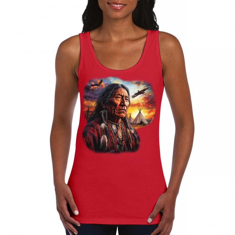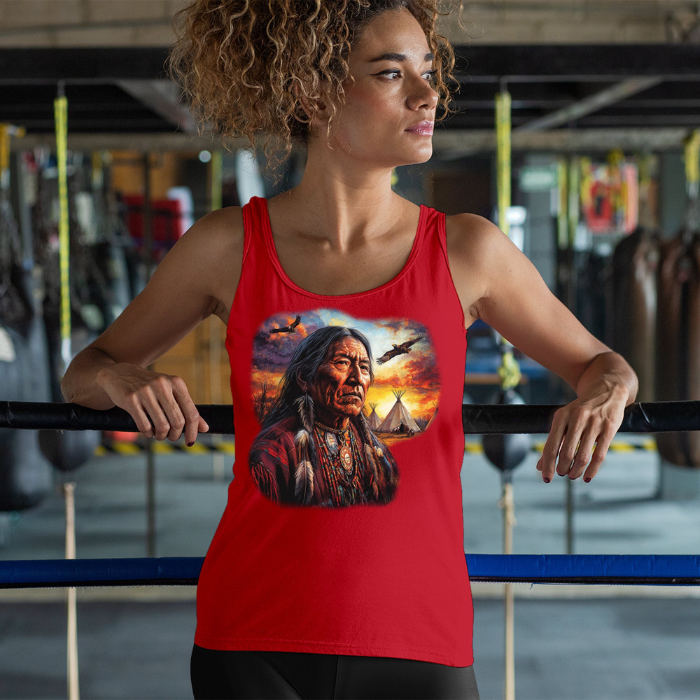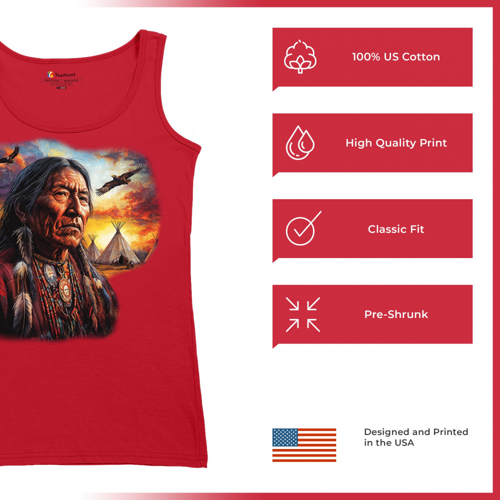 This vivid artwork features a Native American elder in traditional feathered attire, set before a blazing sunset with soaring eagles and peaceful teepees. The scene symbolizes strength, heritage, and spiritual wisdom. A heartfelt tribute to tribal pride, ancestral legacy, and cultural connection to land.
