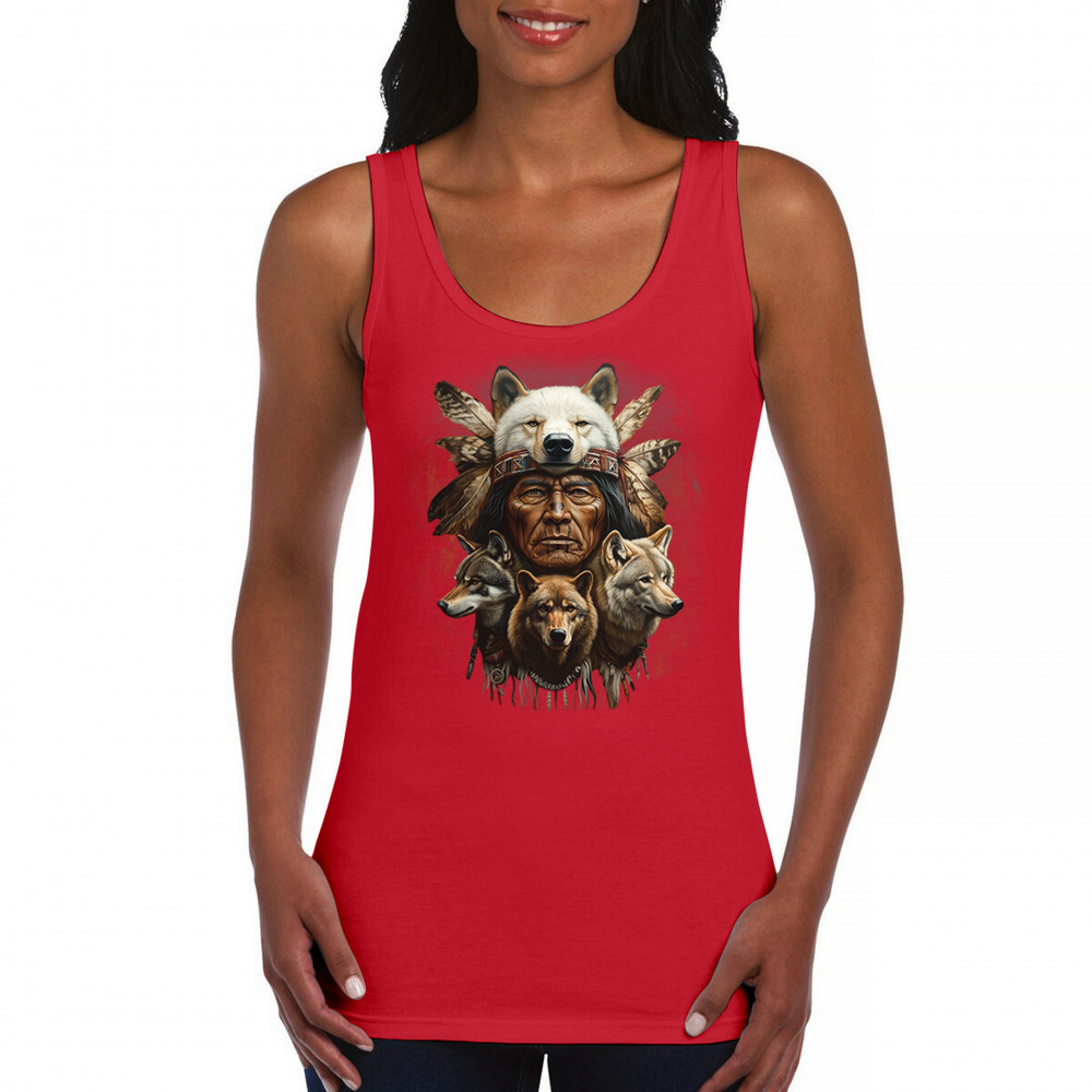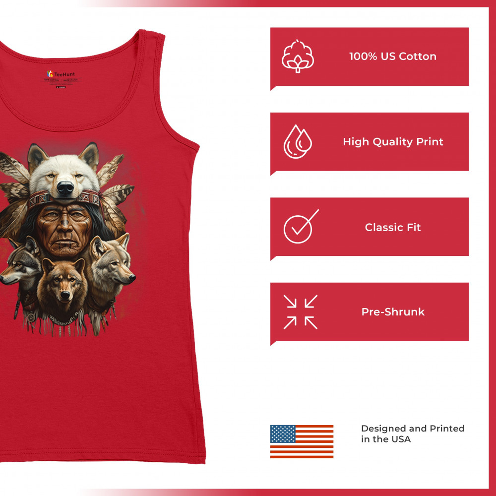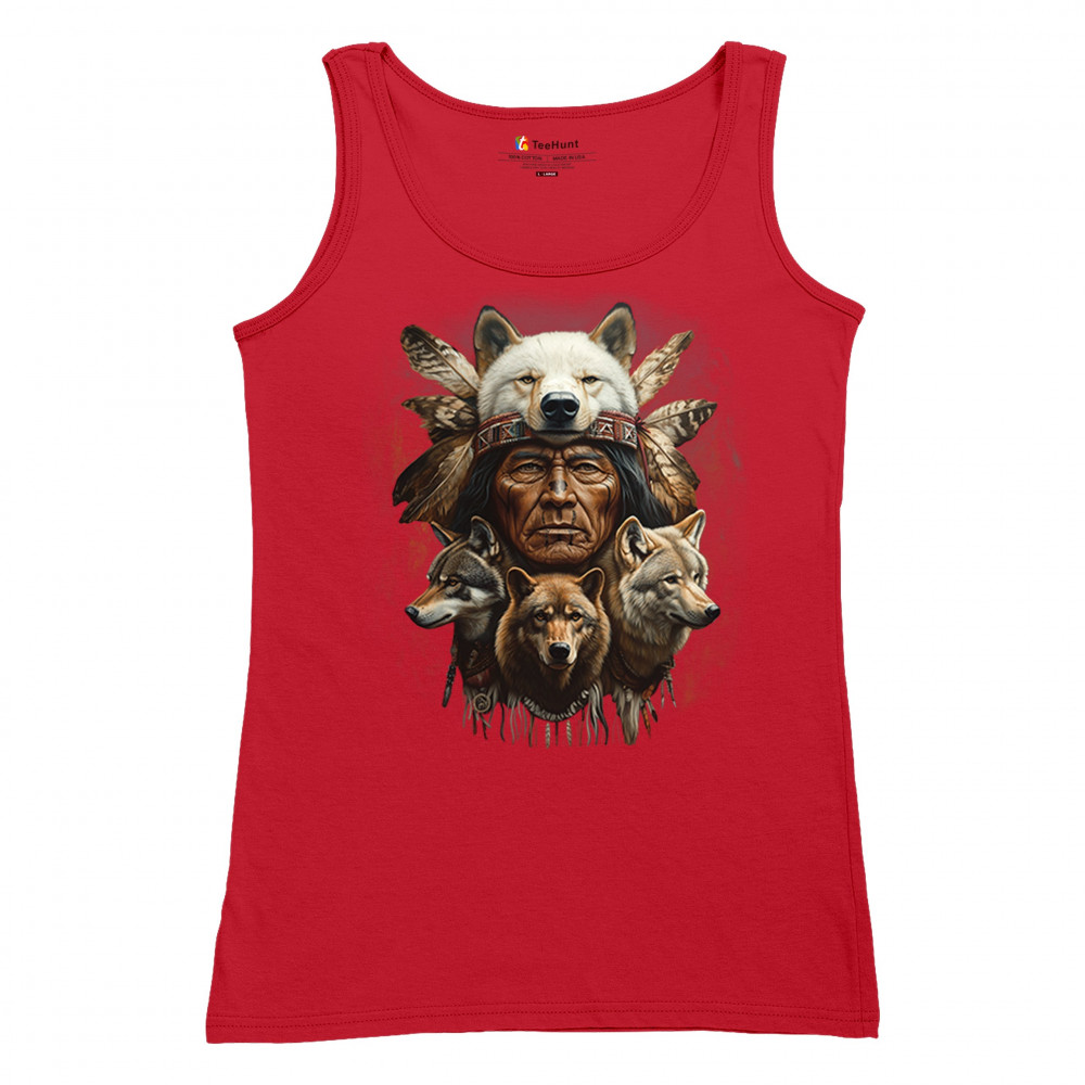 Wolf totem design with Native elder in headdress and guardian wolves. Symbolizes strength, loyalty, spirit animals, and tribal heritage.