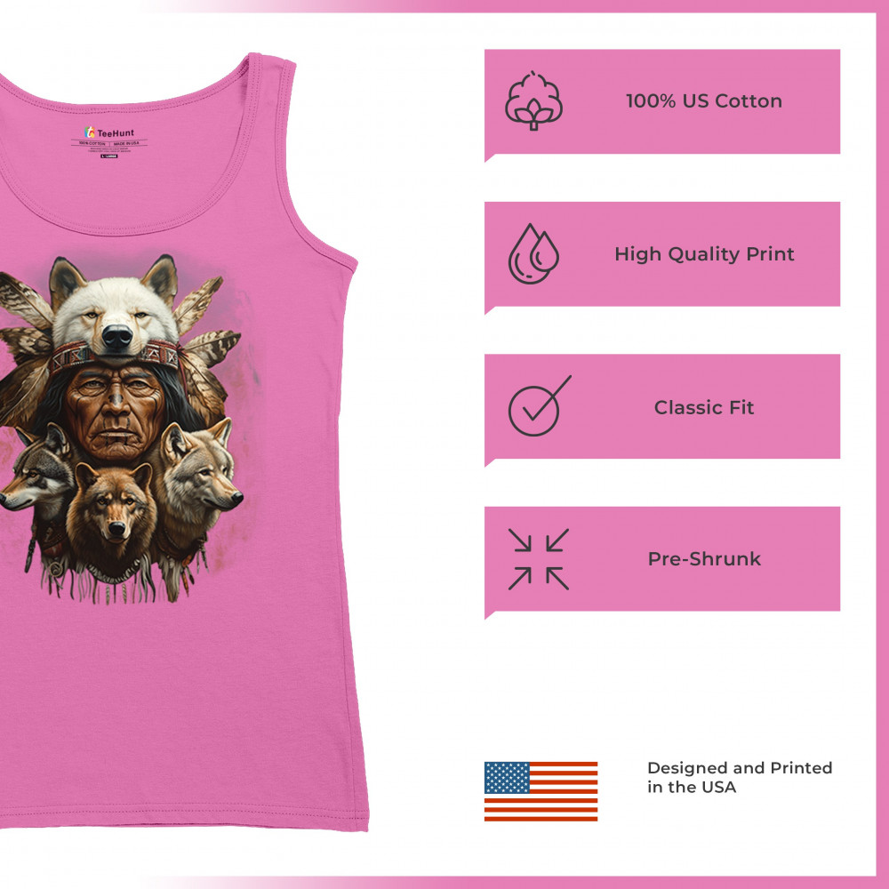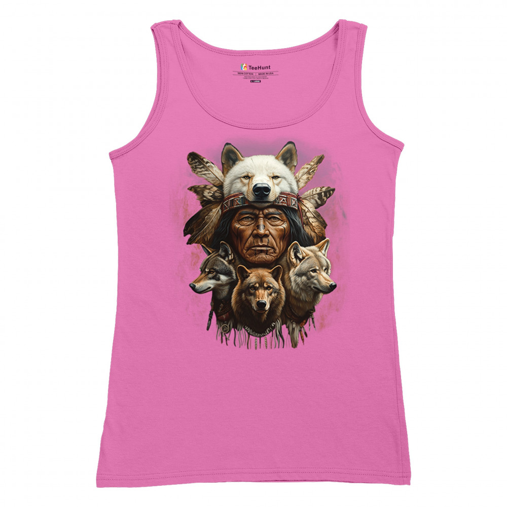 Wolf totem design with Native elder in headdress and guardian wolves. Symbolizes strength, loyalty, spirit animals, and tribal heritage.