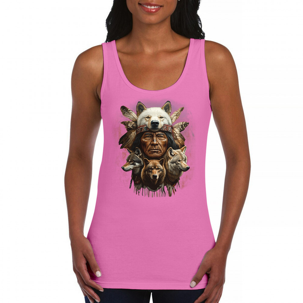 This spiritual tribal design showcases a Native American elder in a detailed wolf headdress surrounded by guardian wolves. It represents strength, loyalty, instinct, and sacred unity with nature. A powerful totem for honoring animal bonds, native pride, and ancestral spiritual guidance through the spirit of the wolf.