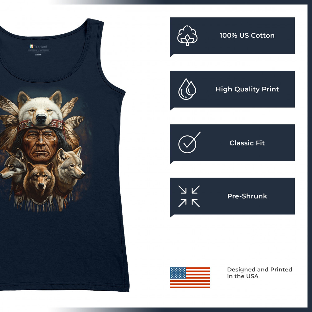 Wolf totem design with Native elder in headdress and guardian wolves. Symbolizes strength, loyalty, spirit animals, and tribal heritage.