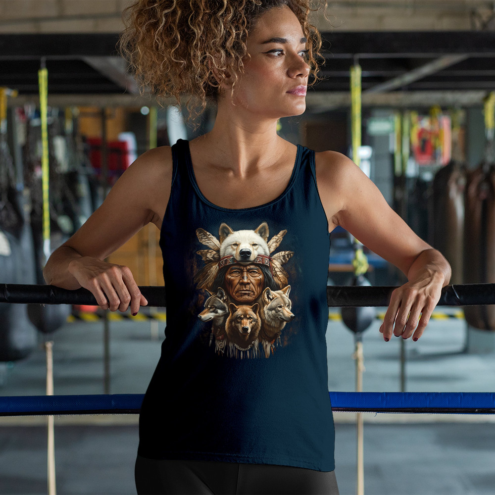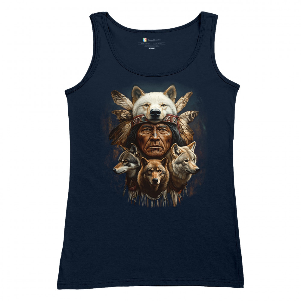 This spiritual tribal design showcases a Native American elder in a detailed wolf headdress surrounded by guardian wolves. It represents strength, loyalty, instinct, and sacred unity with nature. A powerful totem for honoring animal bonds, native pride, and ancestral spiritual guidance through the spirit of the wolf.