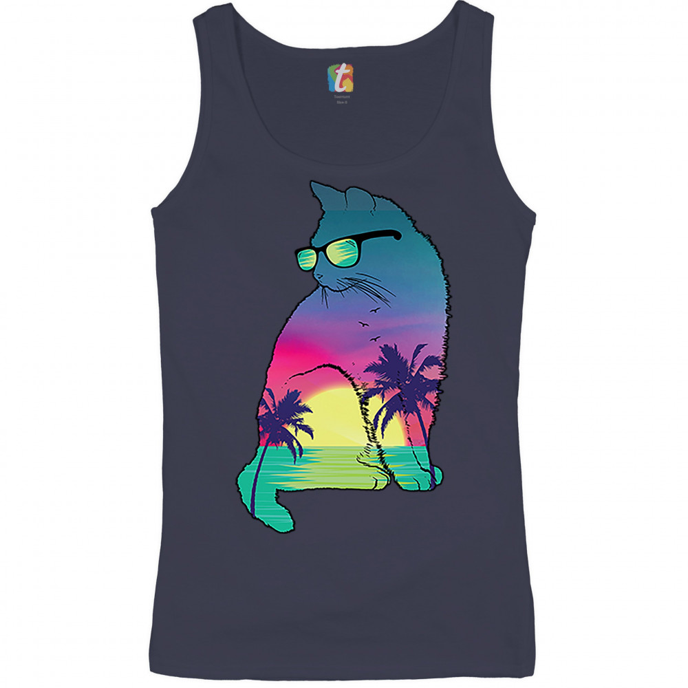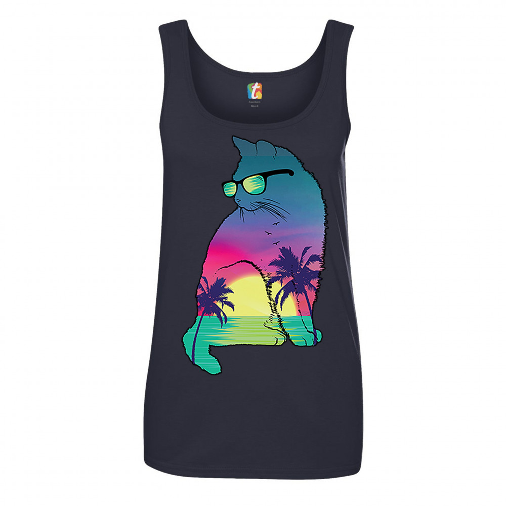 NEON CAT IN SUNGLASSES women's tank top tropic kitten summer beach kitty navy blue