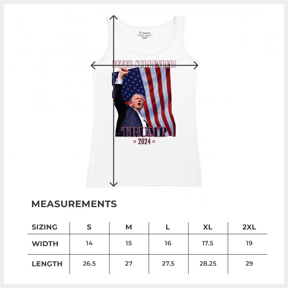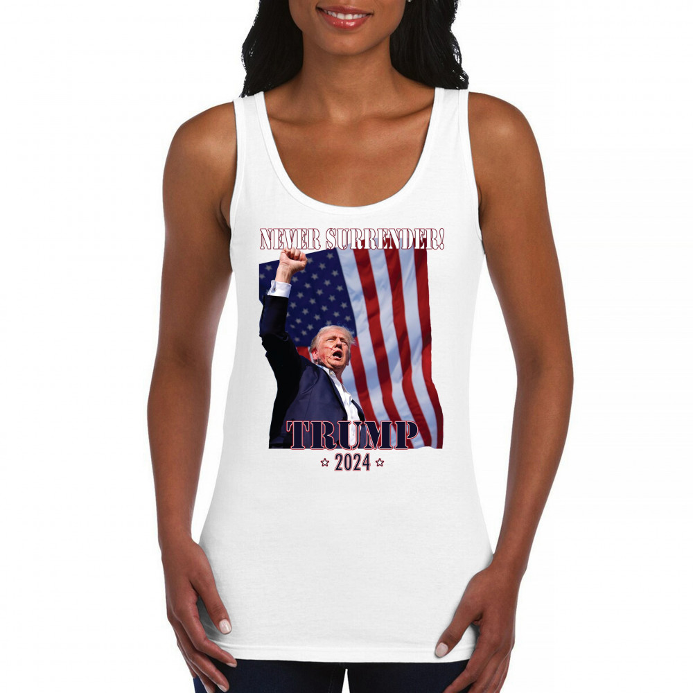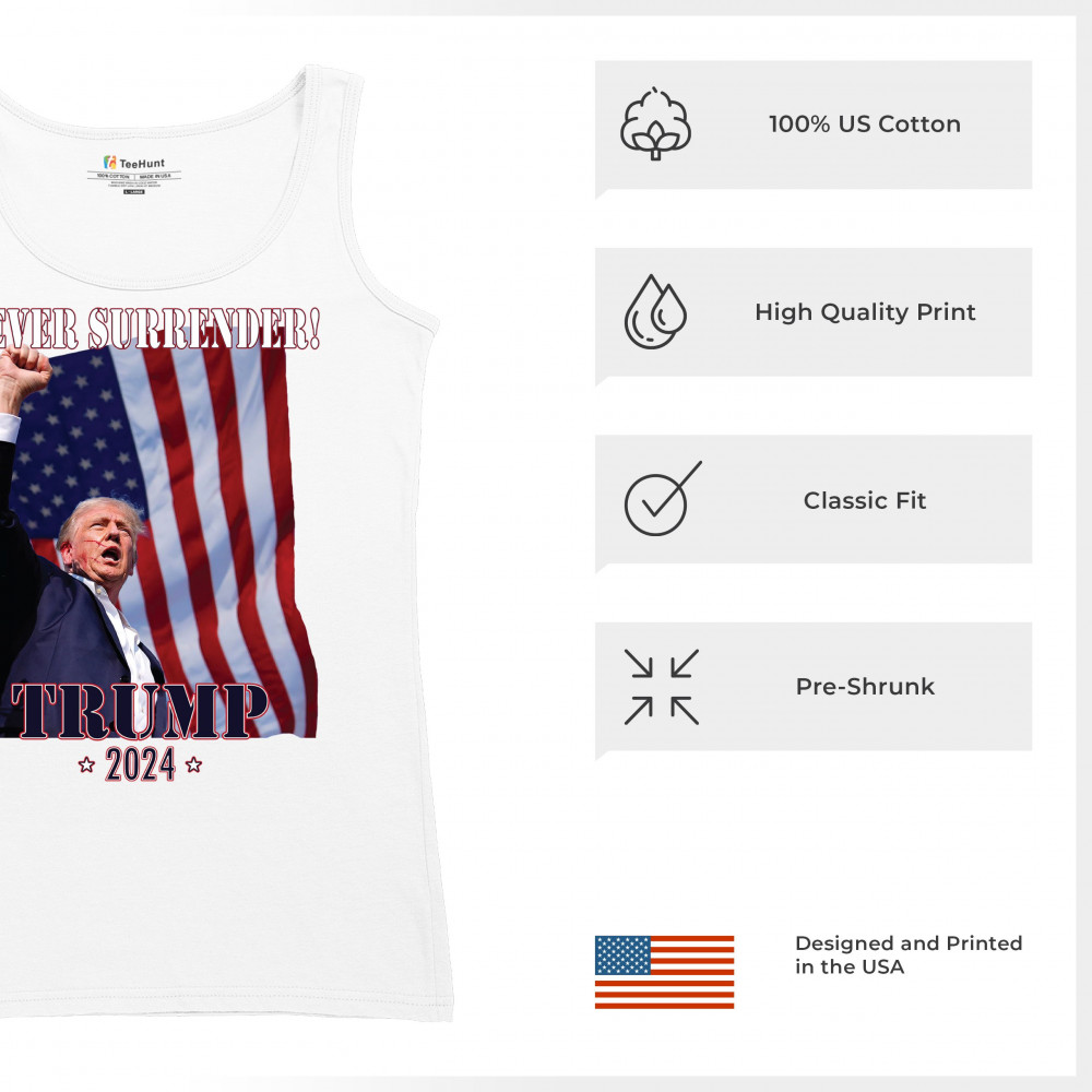 Support Donald Trump with our bold "Never Surrender! Trump 2024" design, featuring Trump against the American flag. Perfect for rallies and everyday wear.