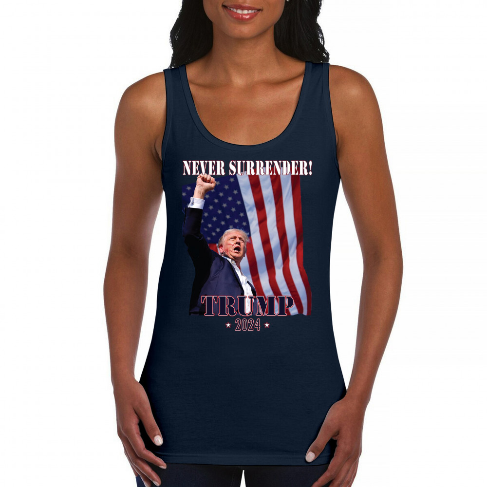 Support Donald Trump with our bold "Never Surrender! Trump 2024" design, featuring Trump against the American flag. Perfect for rallies and everyday wear.
