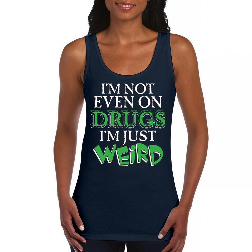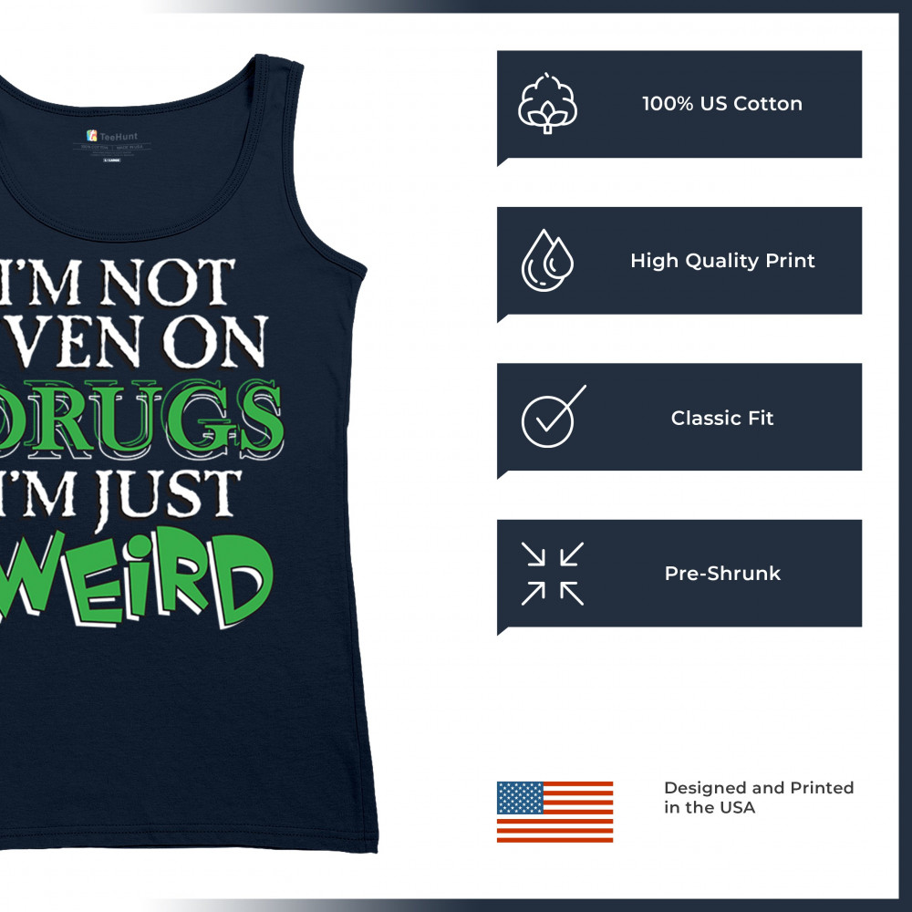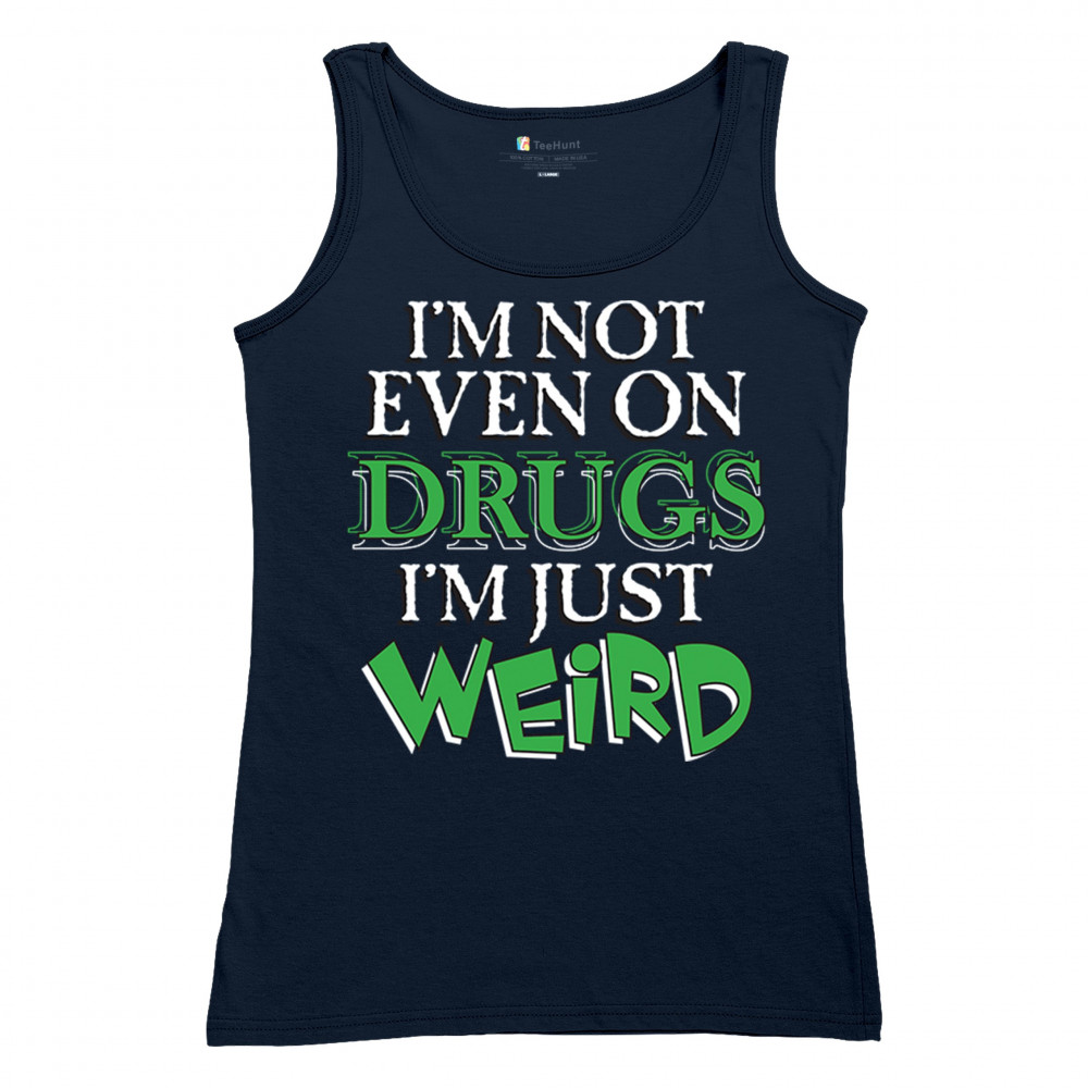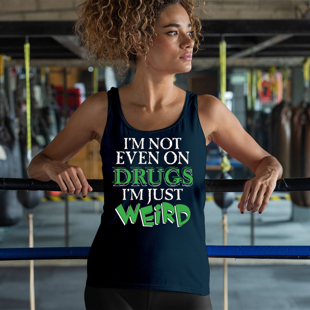 Bold weird design for introverts and quirky minds. Says “I'm not even on drugs I'm just weirdâ€â€”perfect for awkward humor and loud energy.