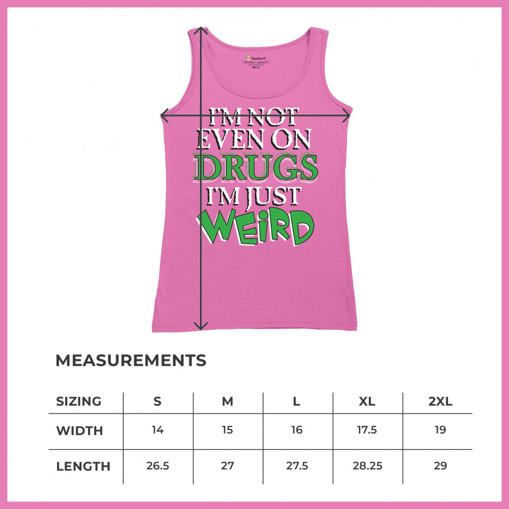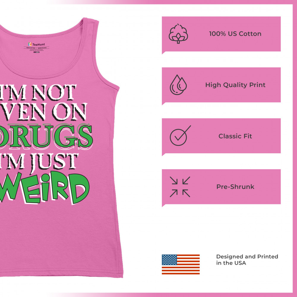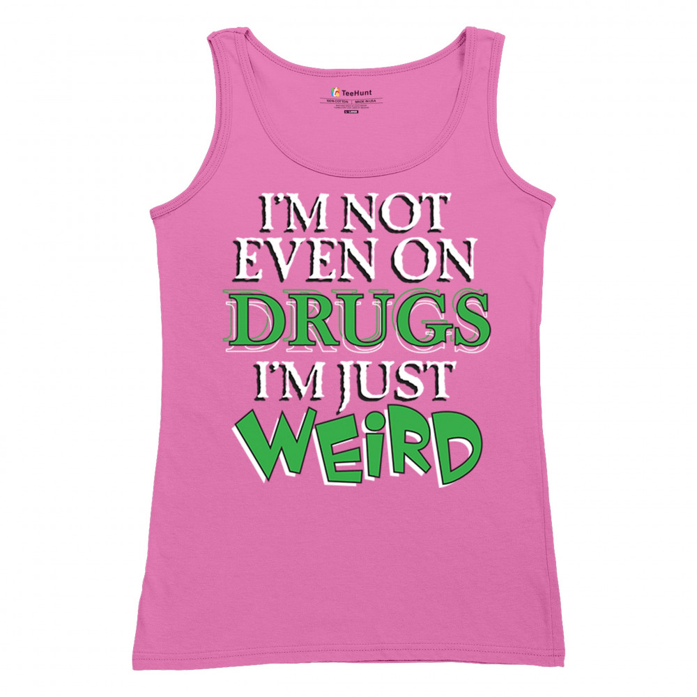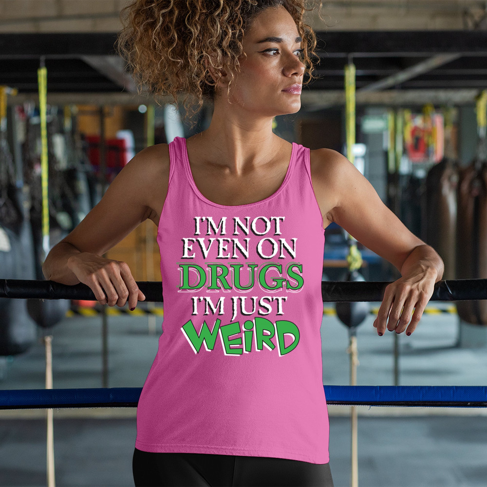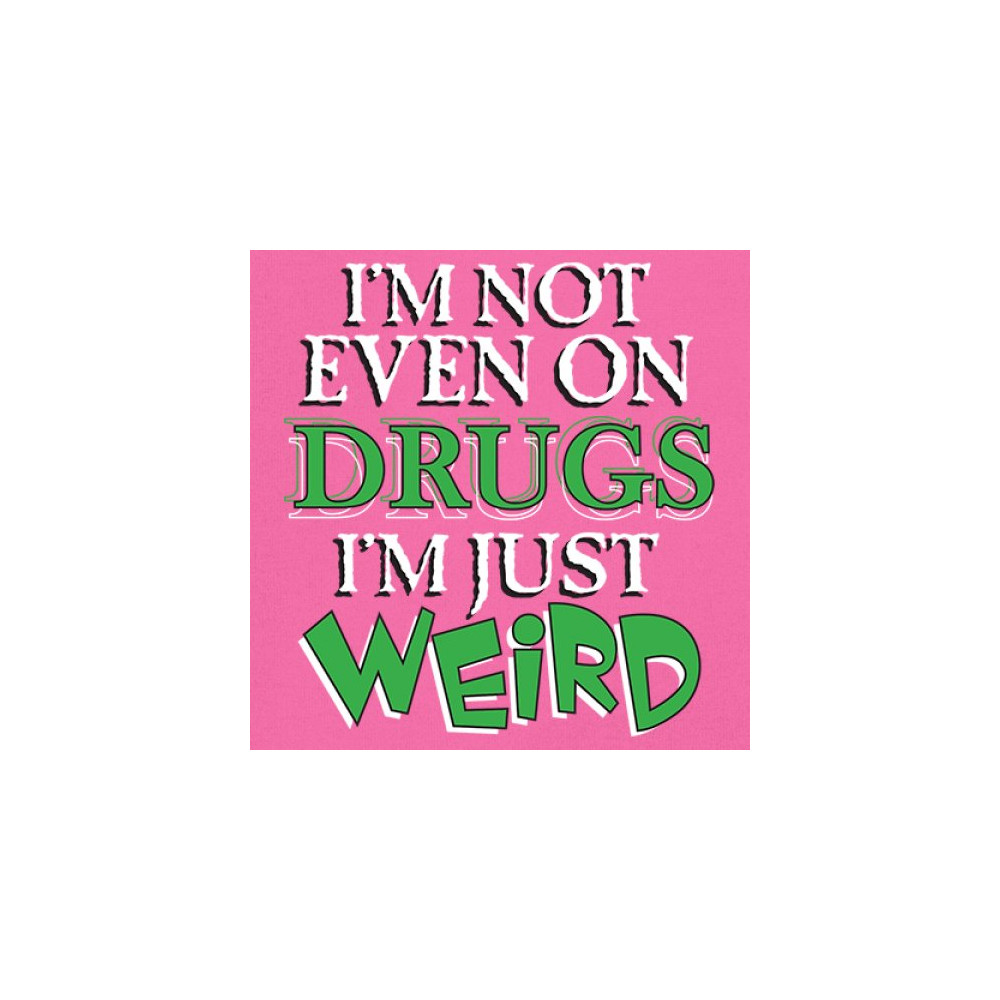 Bold weird design for introverts and quirky minds. Says “I'm not even on drugs I'm just weirdâ€â€”perfect for awkward humor and loud energy.