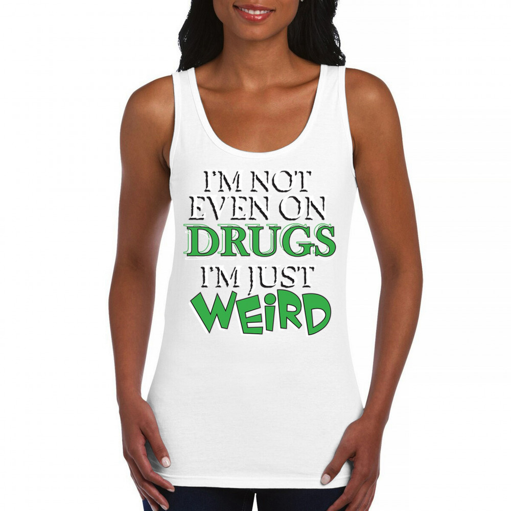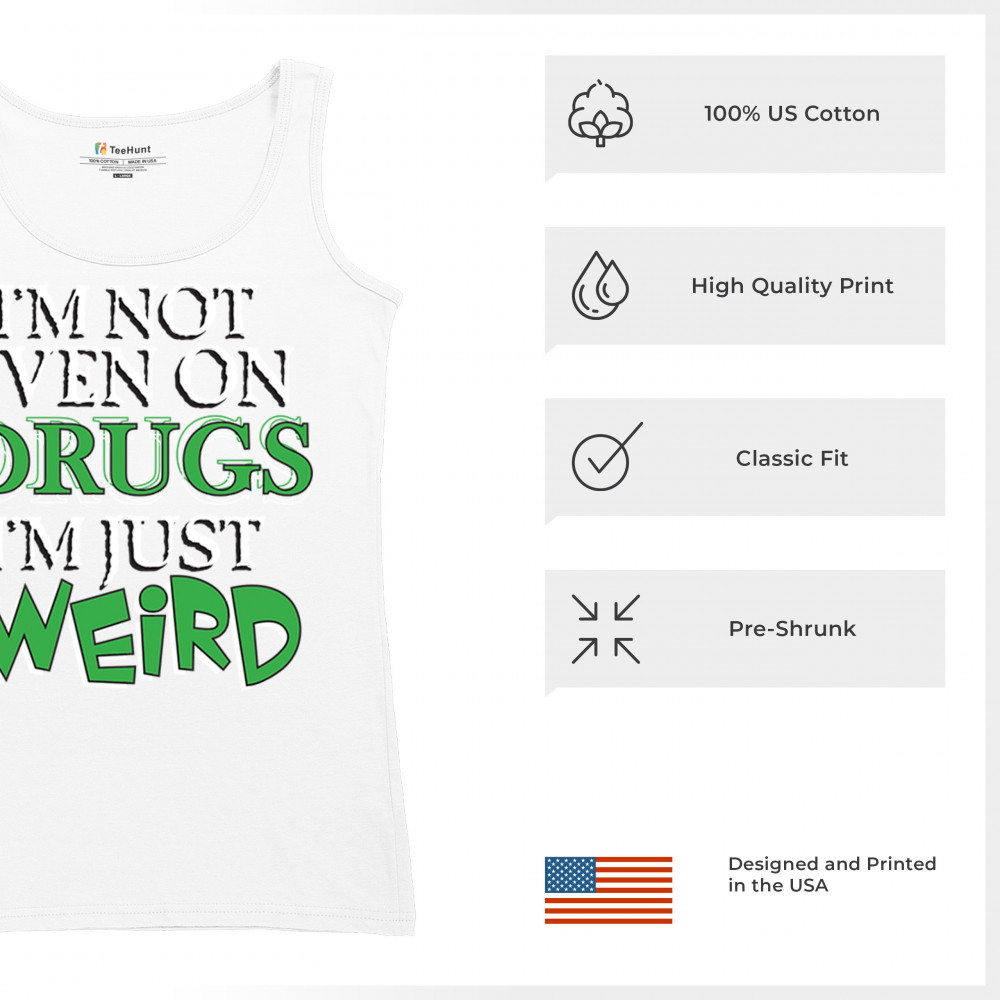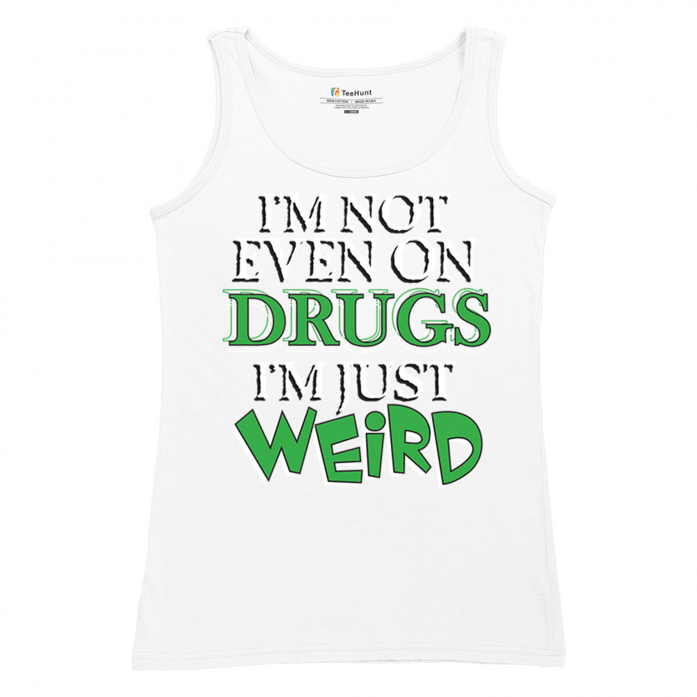 Bold weird design for introverts and quirky minds. Says “I'm not even on drugs I'm just weirdâ€â€”perfect for awkward humor and loud energy.