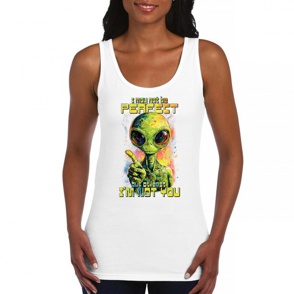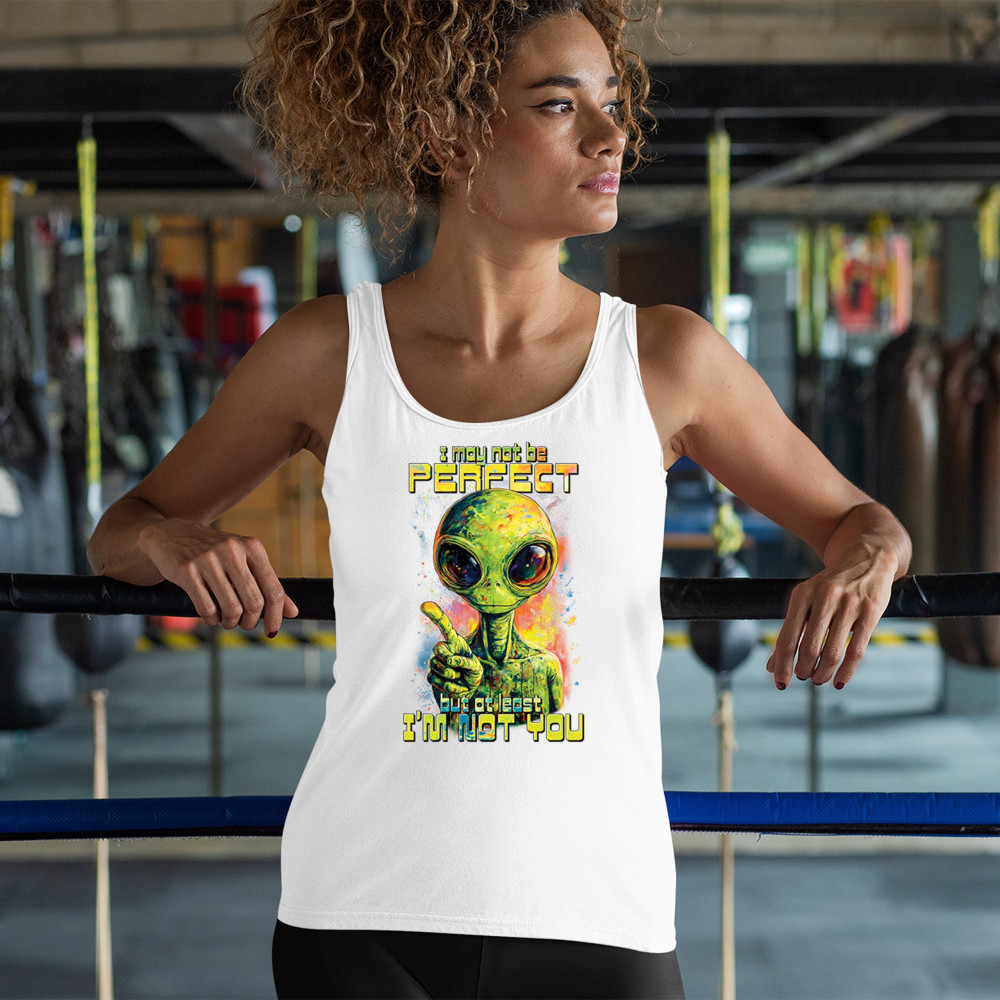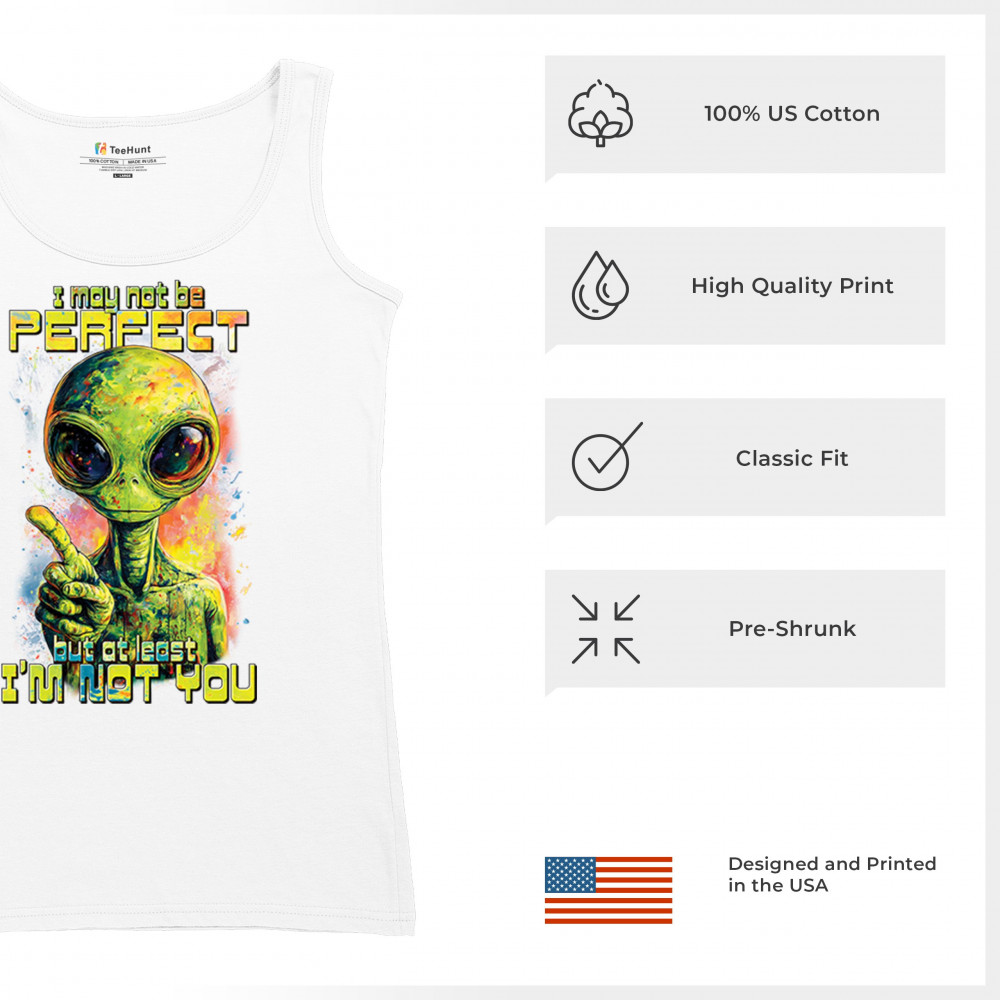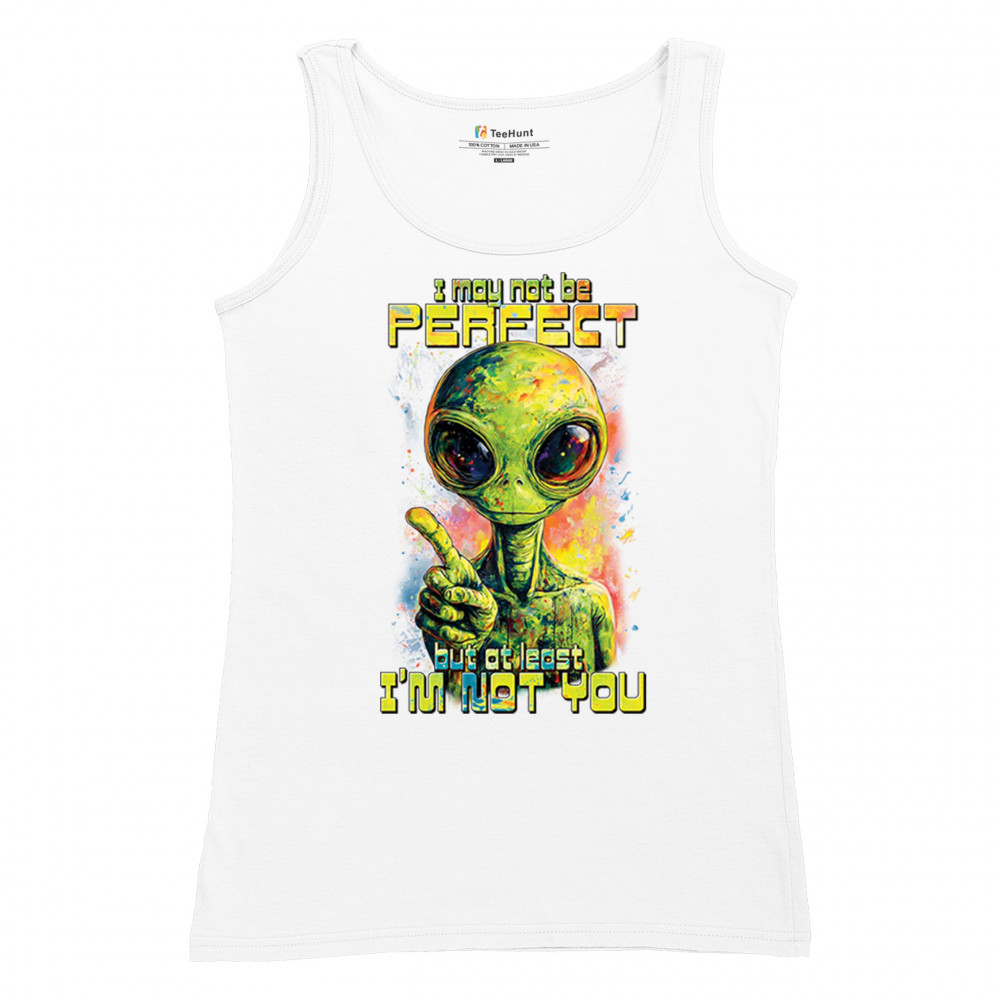This smug alien design delivers sharp sarcastic humor with vibrant cosmic flair. Featuring a big-eyed extraterrestrial and the quote “I may not be perfect, but at least I’m not you,†it’s perfect for sci-fi fans, alien lovers, jokesters, and oddballs alike. A bold, funny statement for parties, UFO events, and festivals.