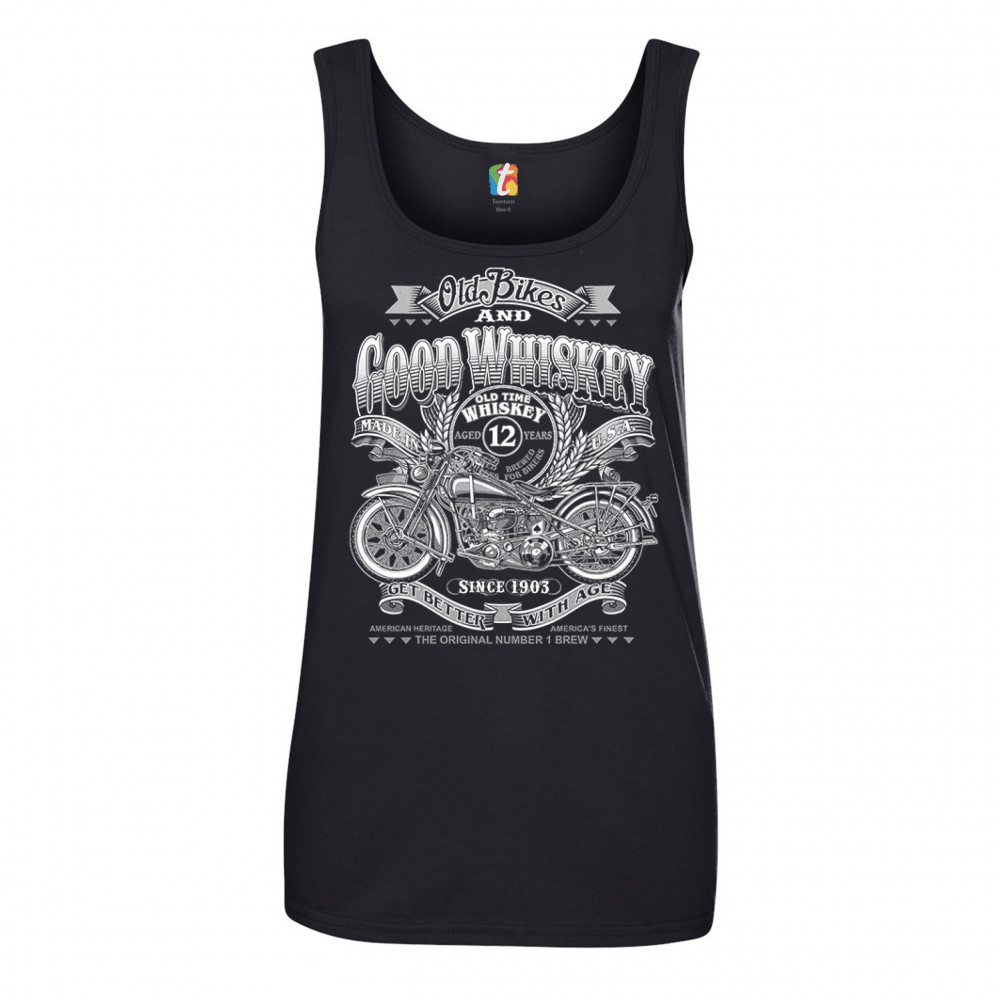 A print featuring a retro motorcycle. The print says: "Old bikes and good whiskey. Since 1903. Get better with age". In the center of the print there is a badge that says: "Old time whiskey, aged 12 years, brewed for bikers. Made in U.S.A". A great choice