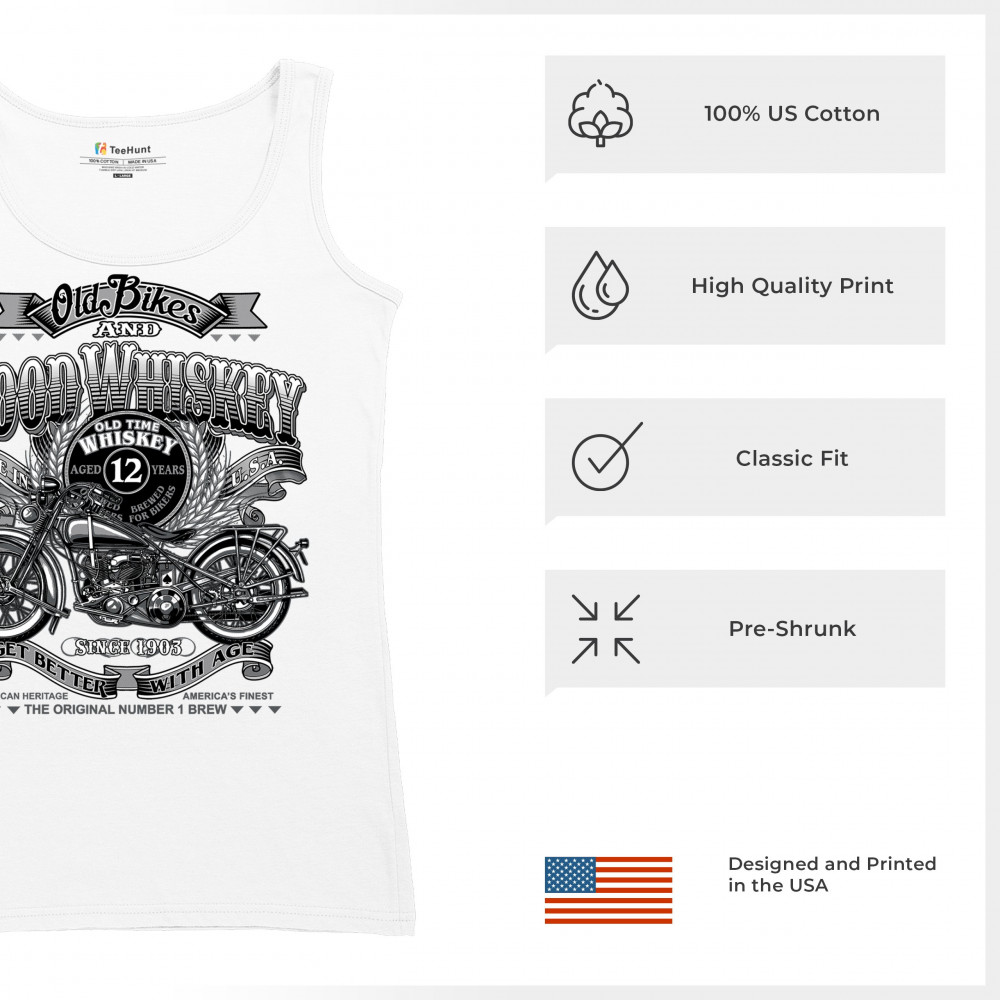 Vintage design with old bike, 12-year whiskey label, and 1903 tribute—perfect for bikers who ride hard and sip slow.