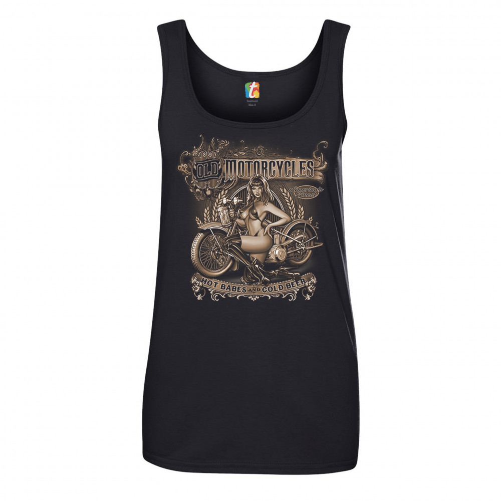 A print featuring a barely dressed sexy woman standing on one knee, holding a beer mug. Behind her there is a vintage motorcycle. The print says: "Old Motorcycles, America's Finest, Hot Babes and Cold Beer". A great choice for a motorcycle enthusiast.