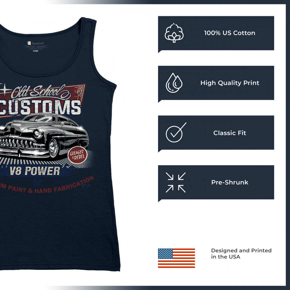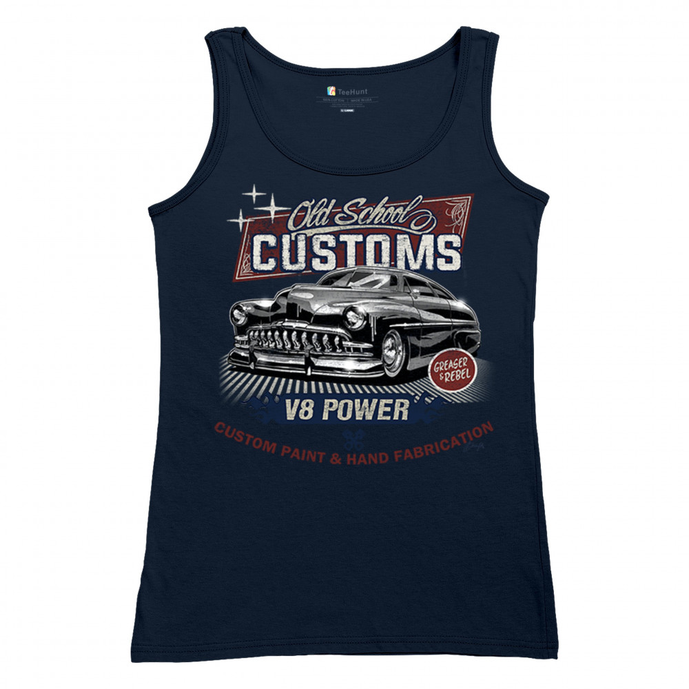 Celebrate classic automotive culture with our "Old School Customs" t-shirt, featuring a V8 power design. Perfect for car enthusiasts and fans of vintage rides.