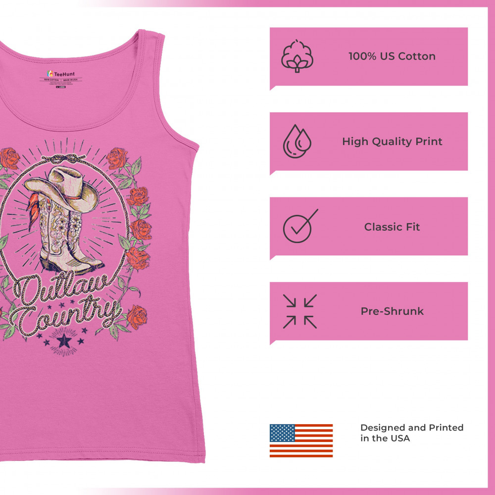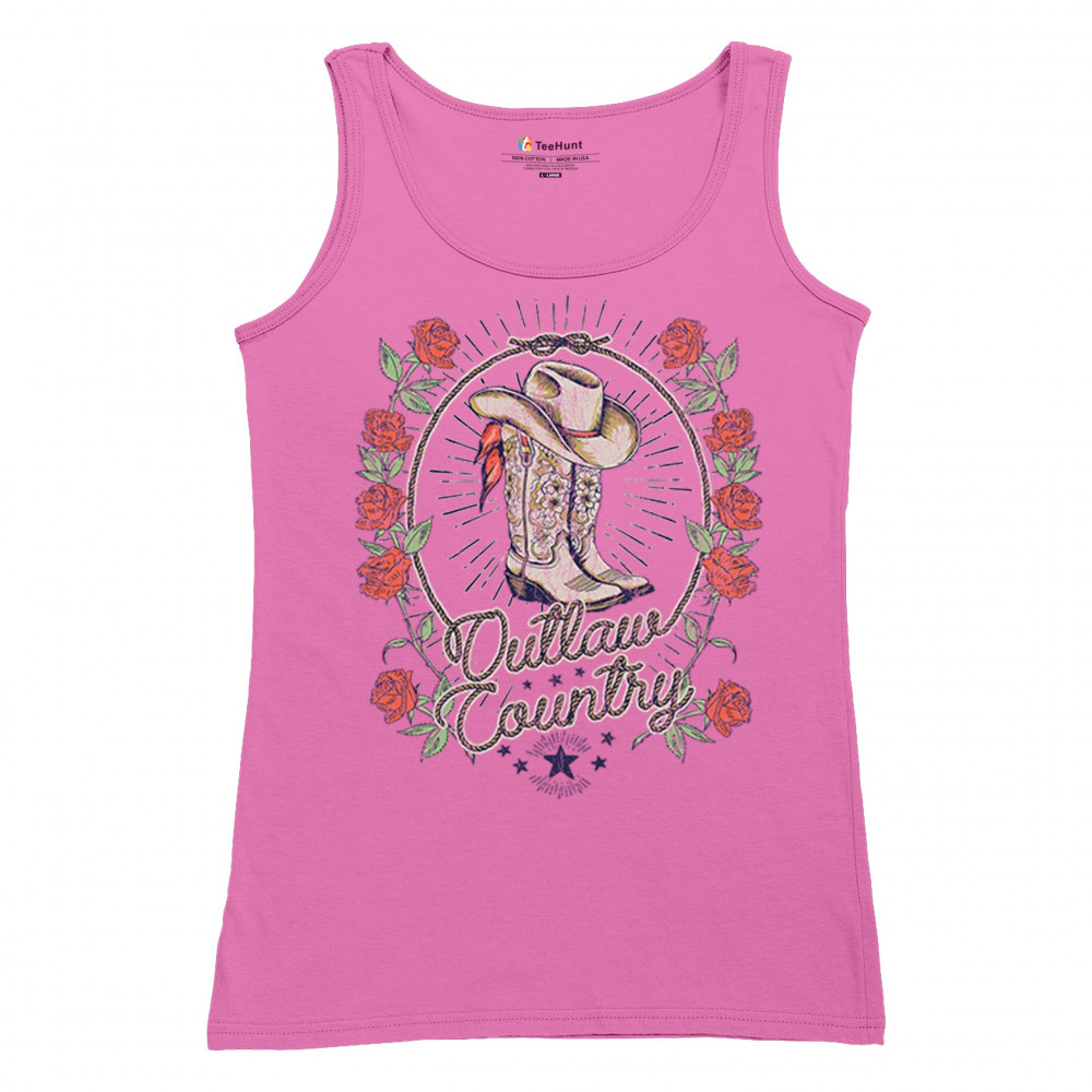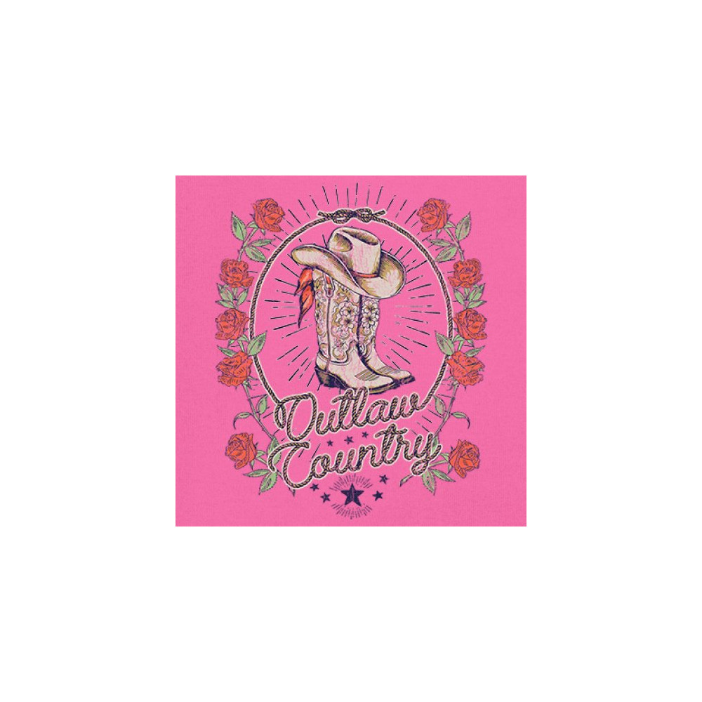 Outlaw country design with cowgirl boots, hat, and roses. Bold feminine western style for concerts, rodeos, and southern lifestyle lovers.