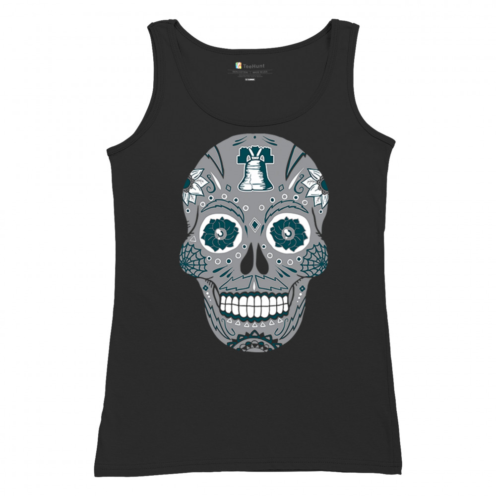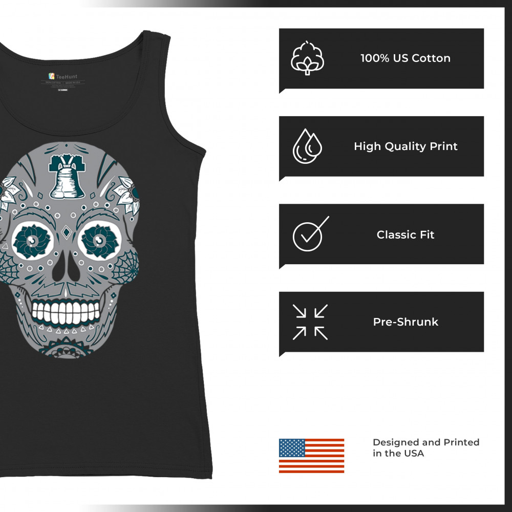 Philly sugar skull with liberty bell art, marigold flower calavera, gothic Philly art, sports culture pride, and game day skull vibes.