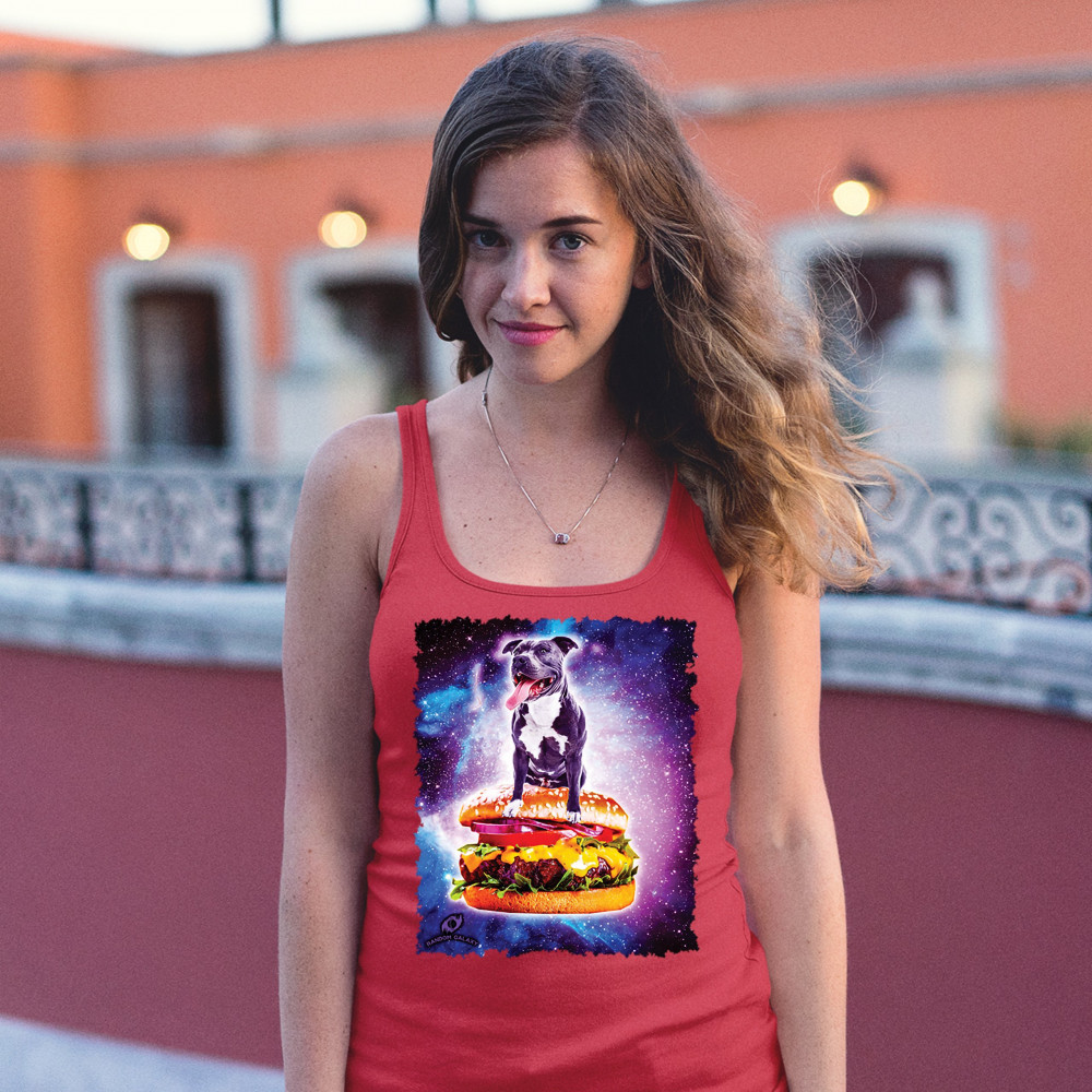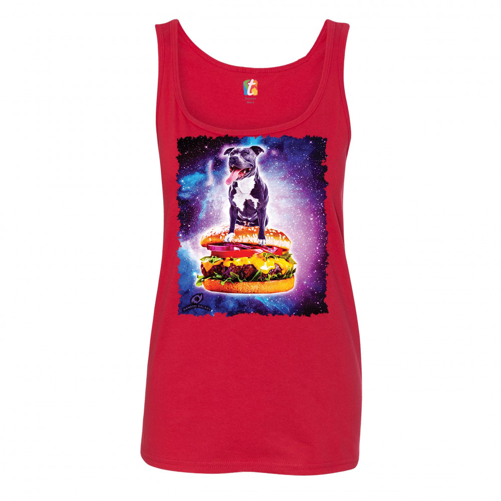 PIT BULL RIDING A BURGER FLYING THROUGH GALAXY women's tank top funny pet red