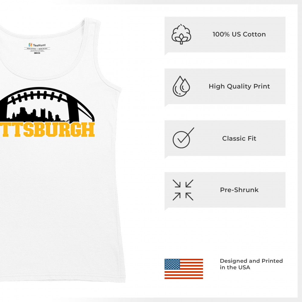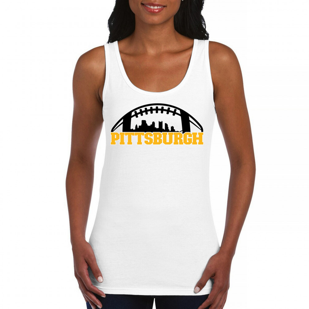 Celebrate Pittsburgh pride with a bold football design featuring the city skyline. Perfect for fans, game days, tailgates, and Steel City enthusiasts.