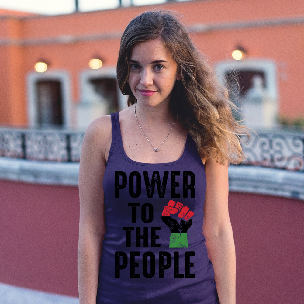 A print saying: "Power to the People". The print features a fist painted in Pan-African colors. Great choice to wear to spread an important message.