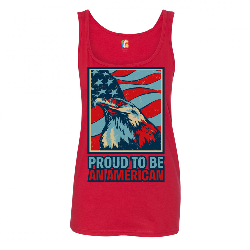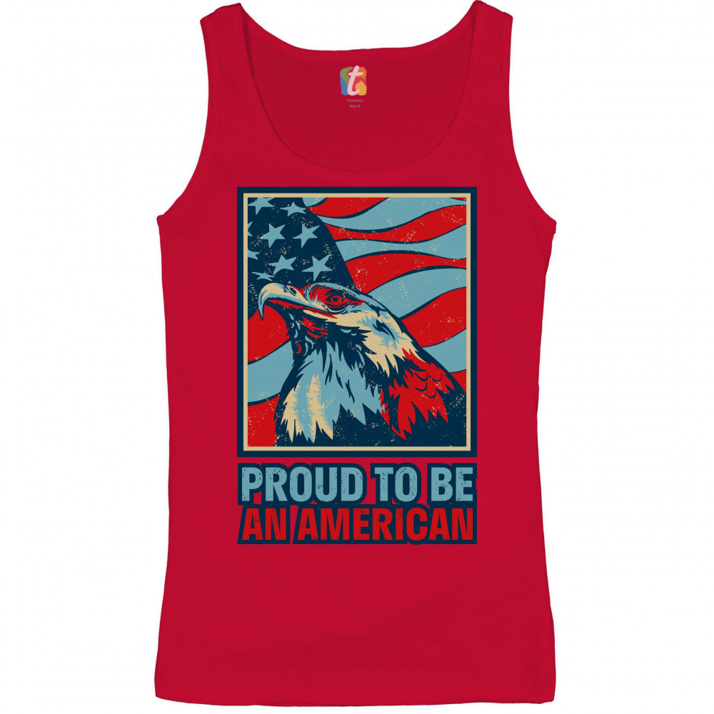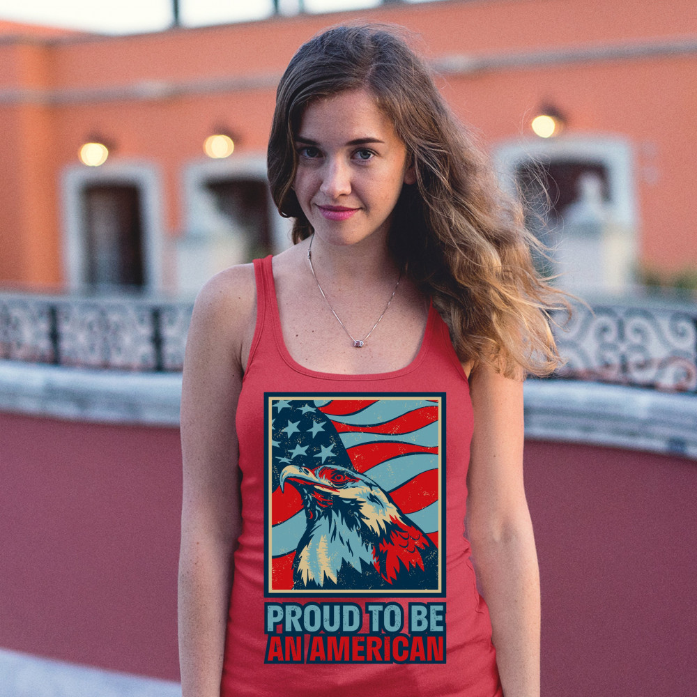 A patriotic print featuring a distressed American Flag in the background and an American Bald Eagle in front of it. Below it the print says: "Proud to Be an American". Great choice to wear on Independence Day or any other patriotic holiday.