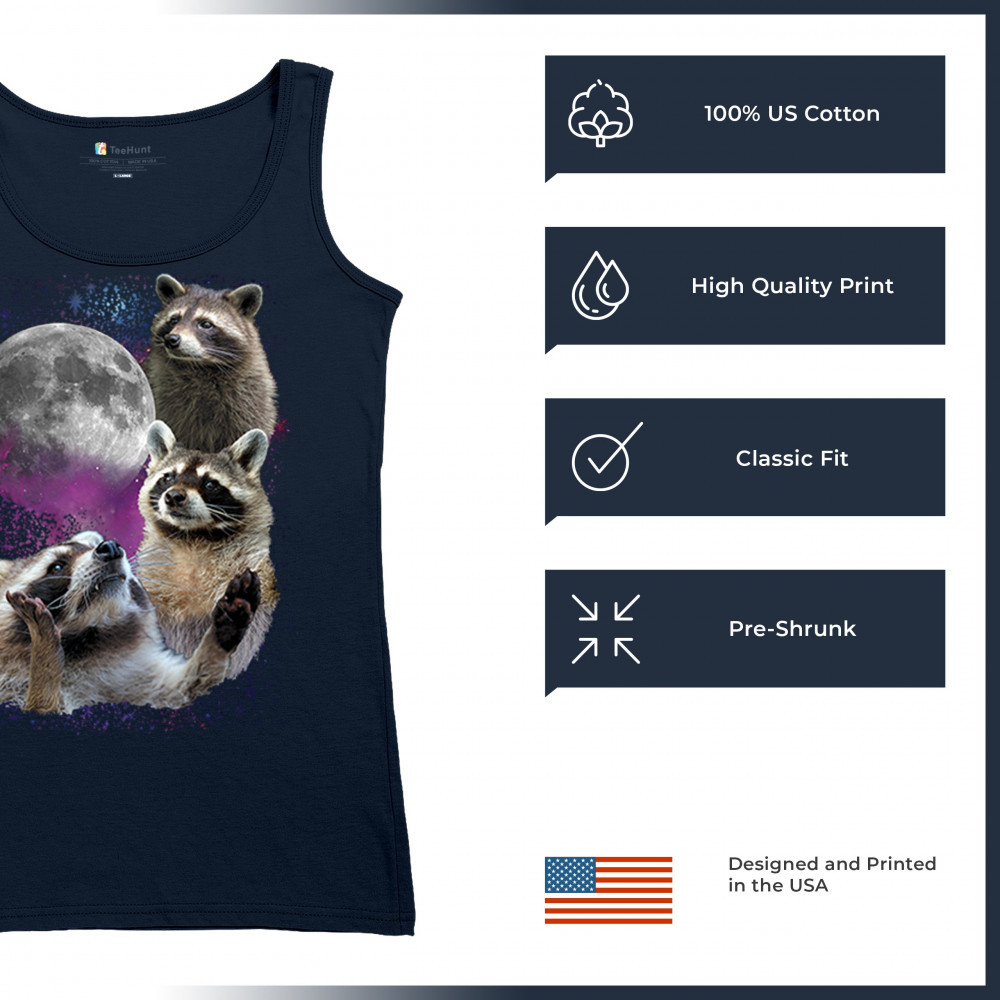 Embrace nature with this quirky raccoon and moon design, perfect for space and animal lovers. Ideal for casual wear or gifts.