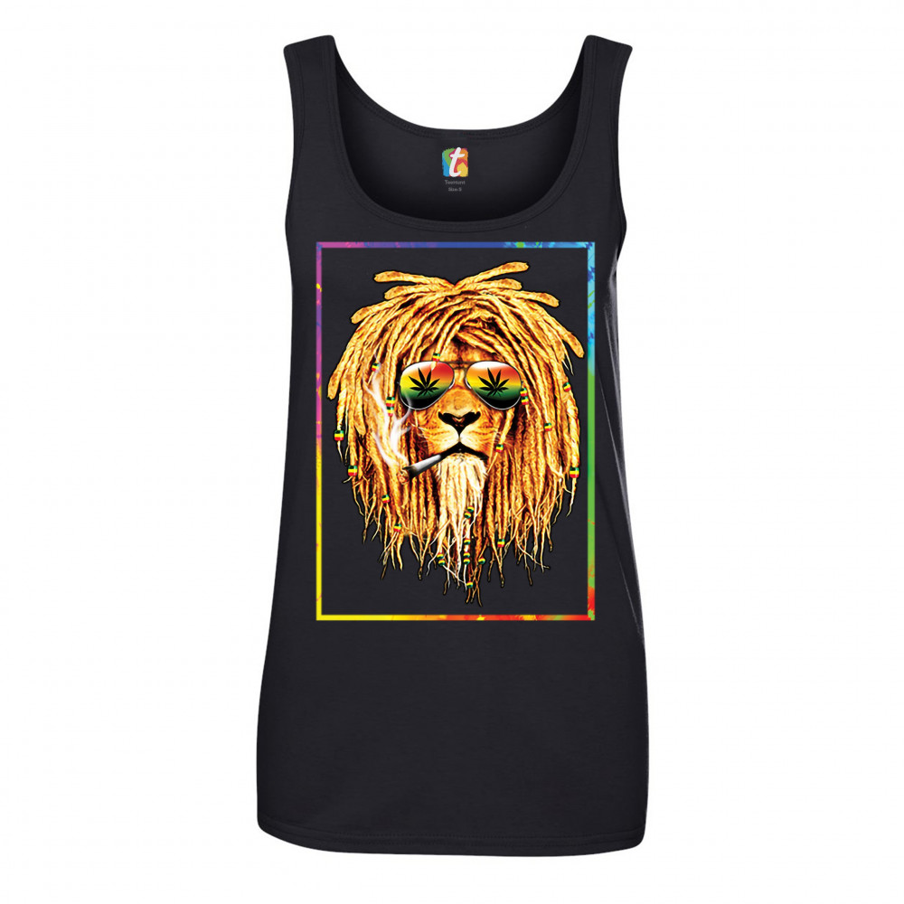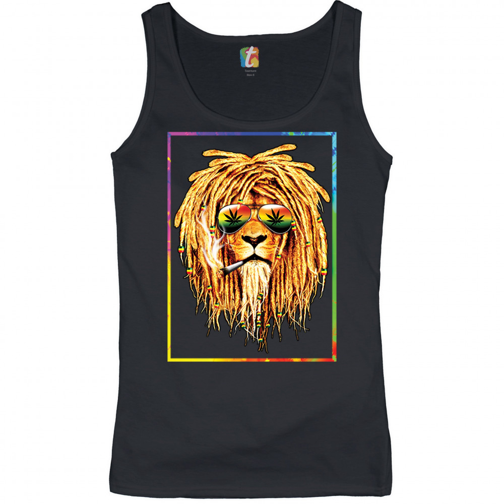 A print featuring a lion with dreadlocks smoking a joint and wearing sunglasses with marijuana leaves reflected in the them. The beads on the lion's dreadlocks and the glasses are painted with traditional Jamaican colors. Great choice for a pot aficionado