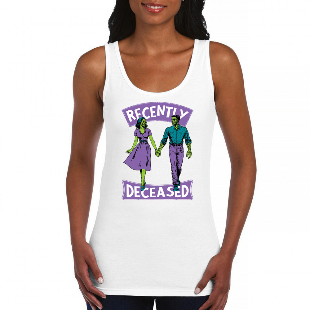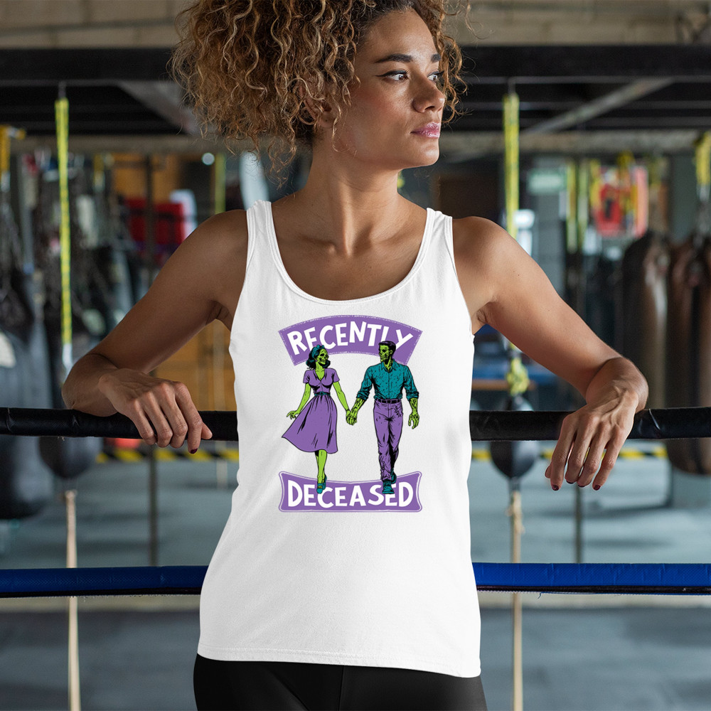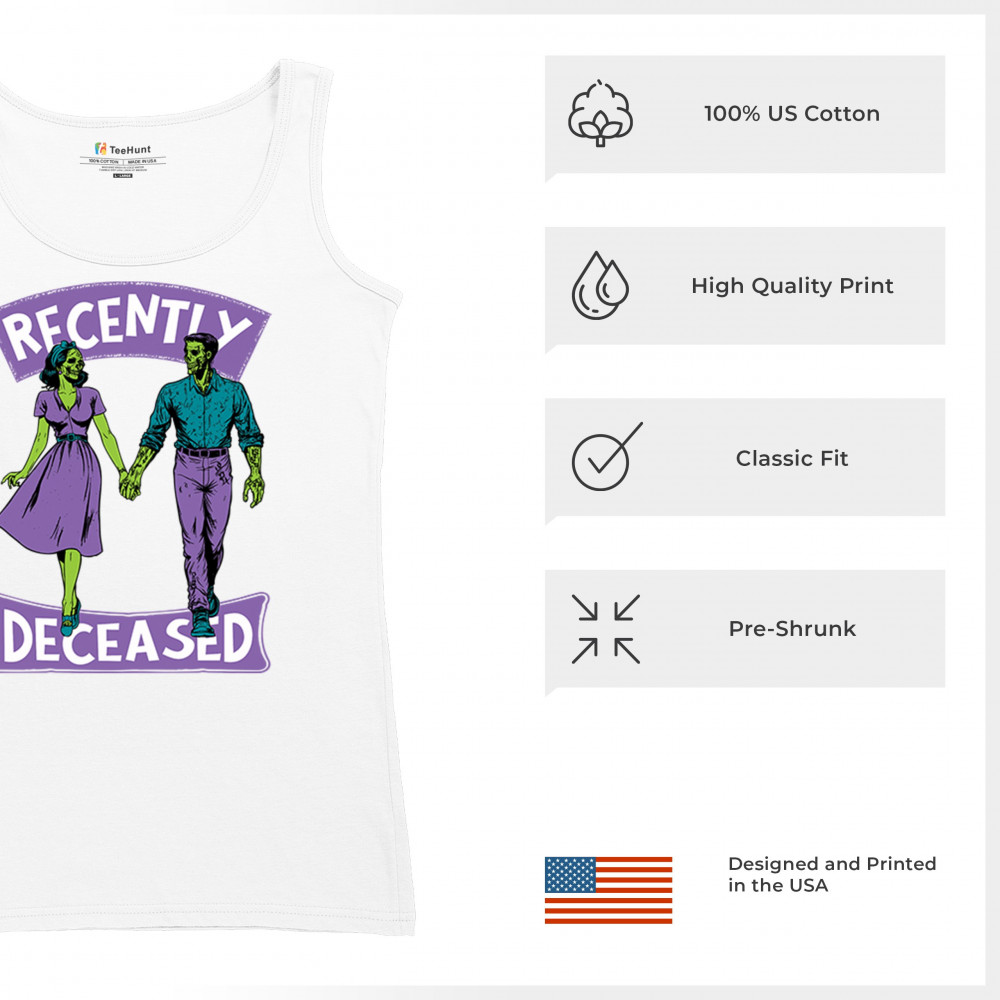Recently Deceased zombie couple shirt with undead lovers design, spooky season humor, Halloween zombie outfit, and haunted house vibes.