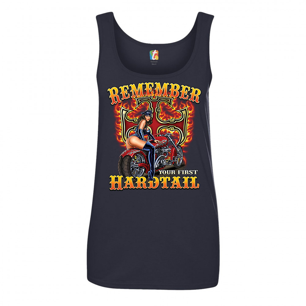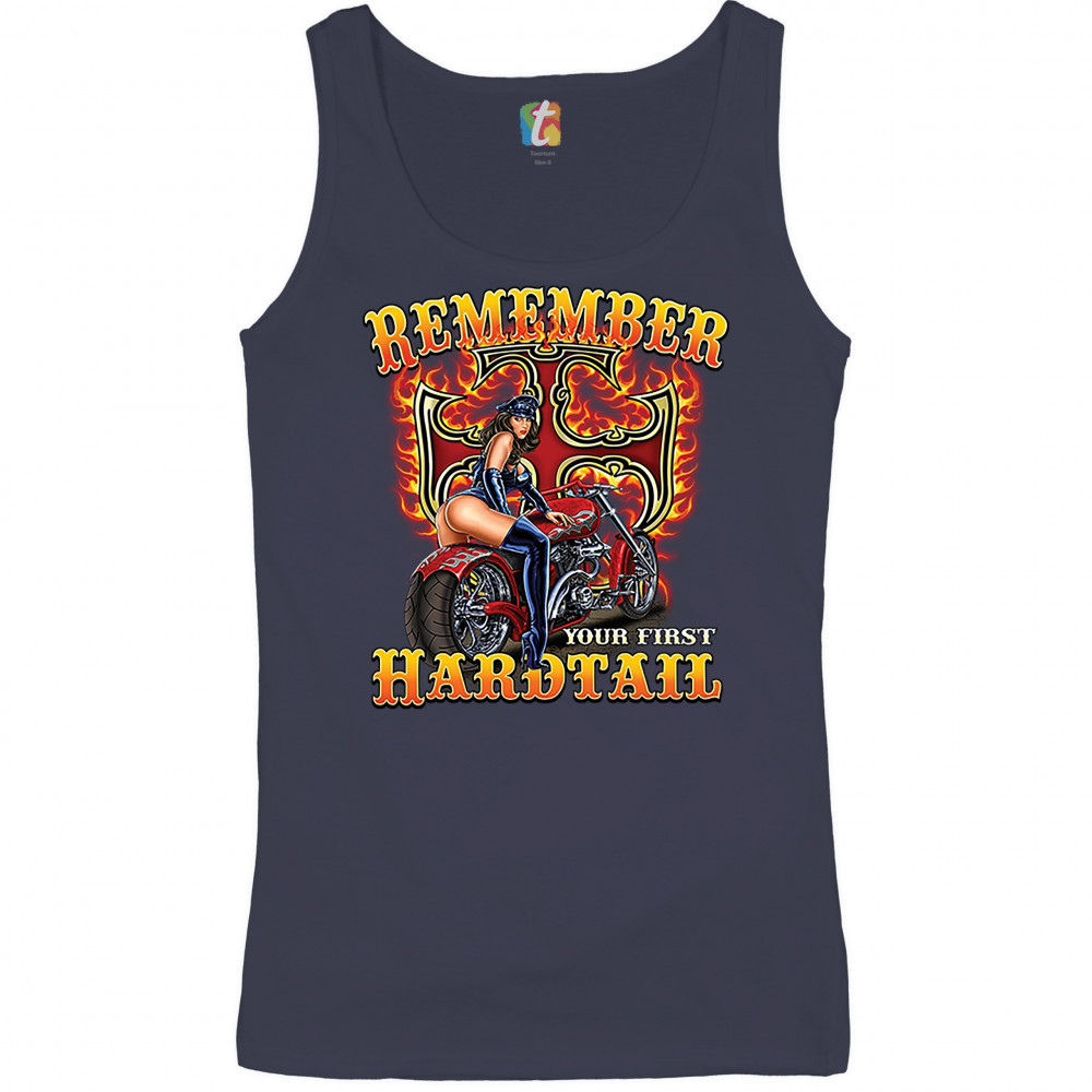 REMEMBER YOUR FIRST HARDTAIL women's tank top biker babe motorcycle chopper navy blue