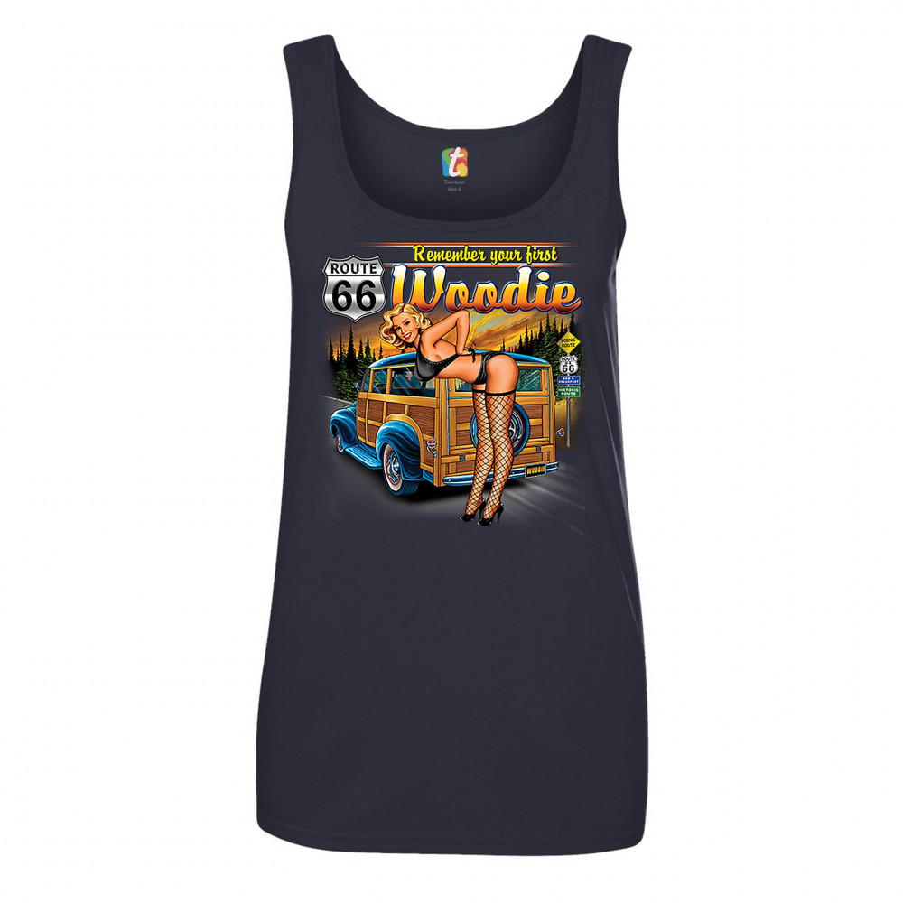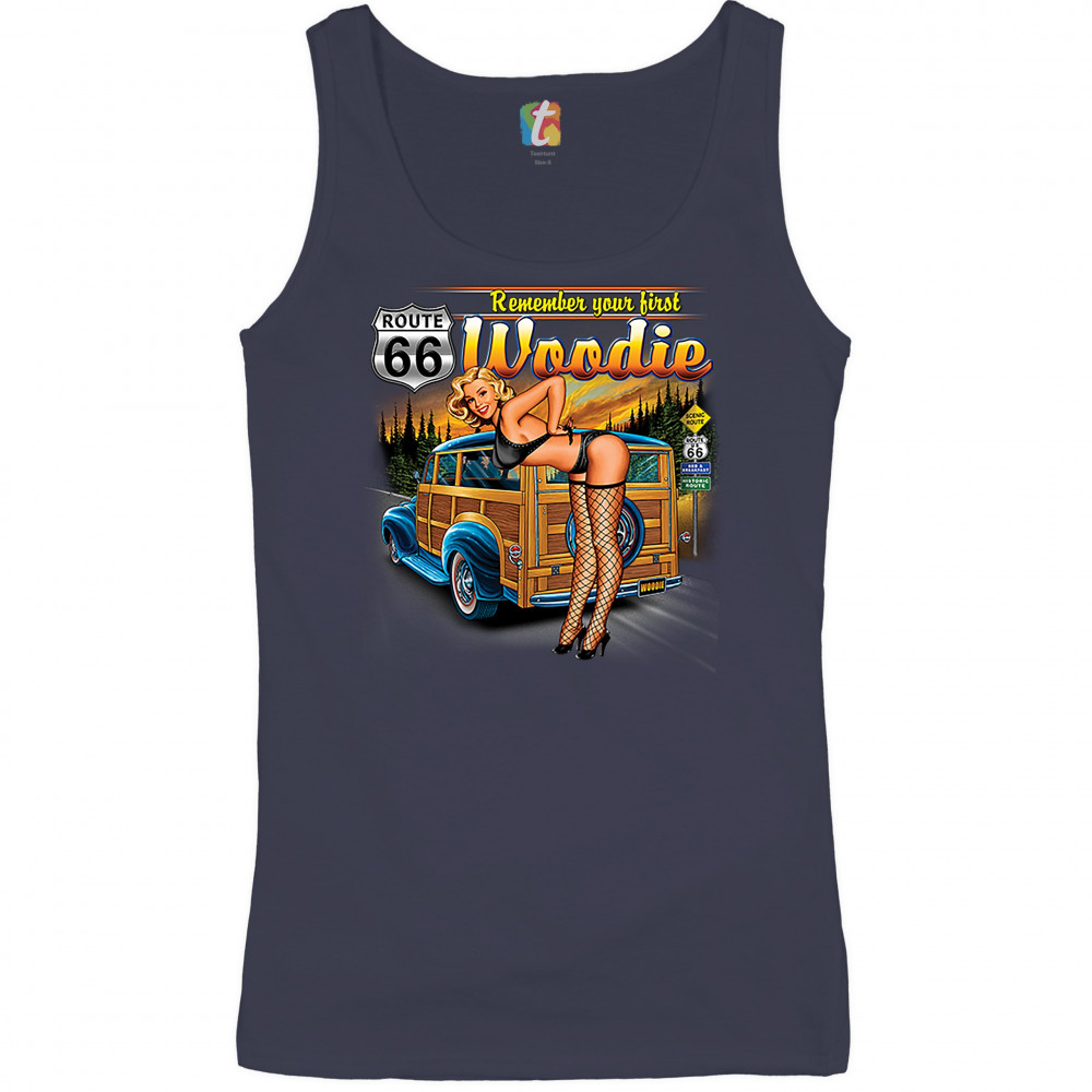 A print featuring a sexy blonde pin-up girl bending over and taking off her bra. Behind her there is a woodie wagon driving on a road. The print says: "Remeber your first woodie" and features a Route 66. A great choice for a fan of the legendary Mother Ro