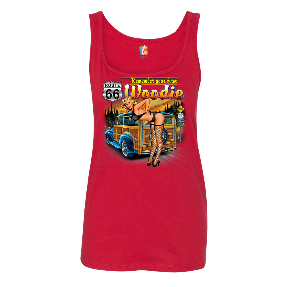 A print featuring a sexy blonde pin-up girl bending over and taking off her bra. Behind her there is a woodie wagon driving on a road. The print says: "Remeber your first woodie" and features a Route 66. A great choice for a fan of the legendary Mother Ro