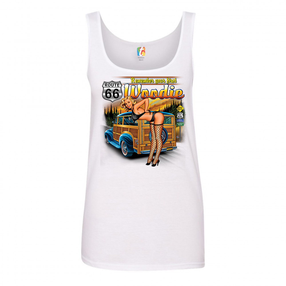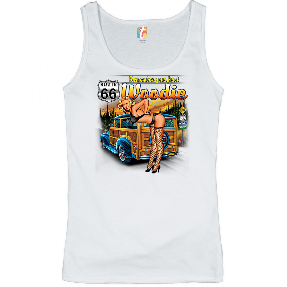 A print featuring a sexy blonde pin-up girl bending over and taking off her bra. Behind her there is a woodie wagon driving on a road. The print says: "Remeber your first woodie" and features a Route 66. A great choice for a fan of the legendary Mother Ro