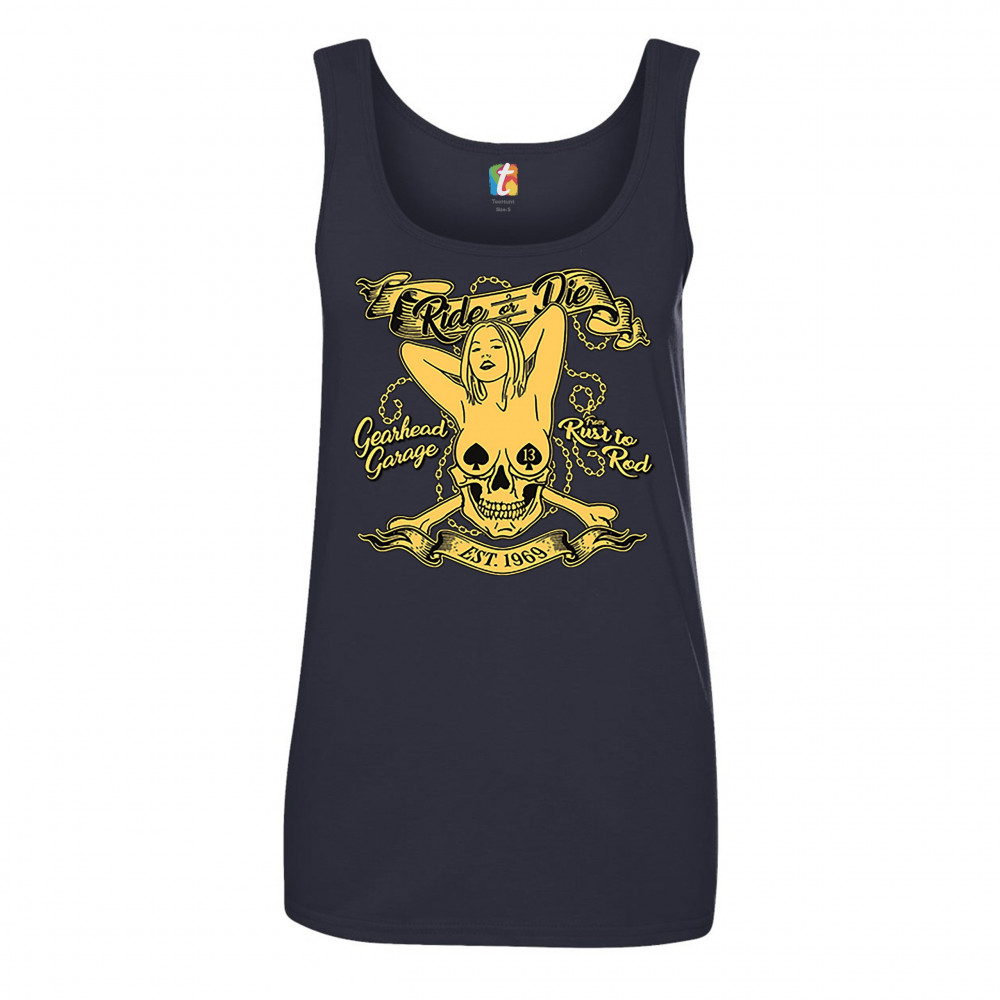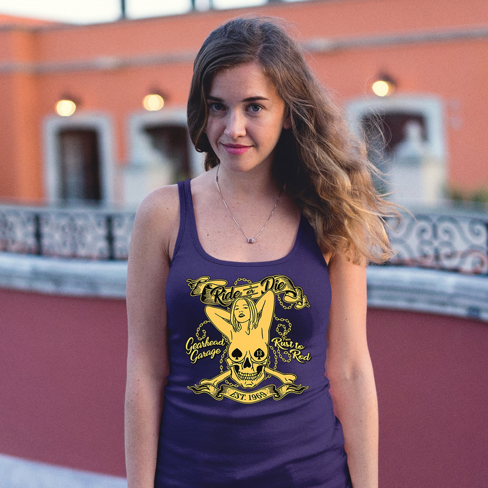A print featuring a naked woman with her hands behind her head and spades as nipple covers. Her body is mixed with a skull. There are crossed bones and multiple chains in the background. The print says: "Ride or Die, Gearhead Garage, Rust to Rod, Est. 196