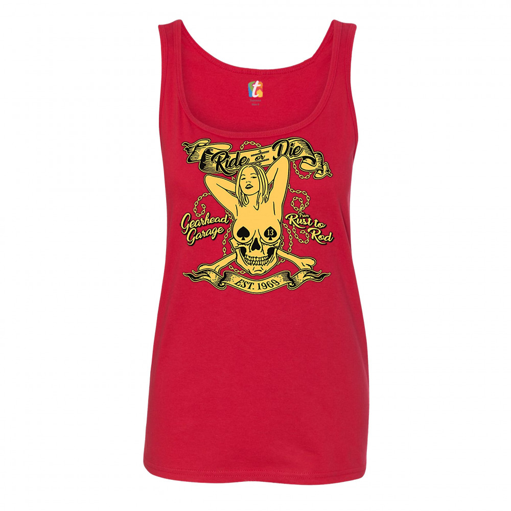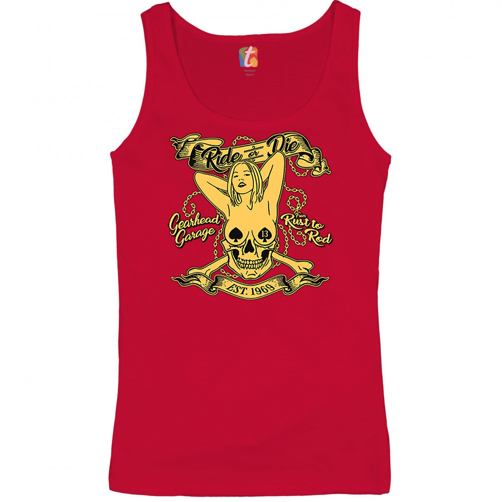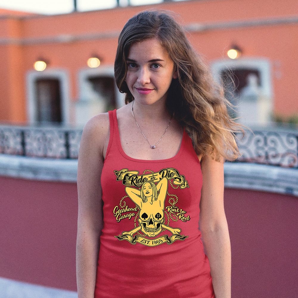 A print featuring a naked woman with her hands behind her head and spades as nipple covers. Her body is mixed with a skull. There are crossed bones and multiple chains in the background. The print says: "Ride or Die, Gearhead Garage, Rust to Rod, Est. 196