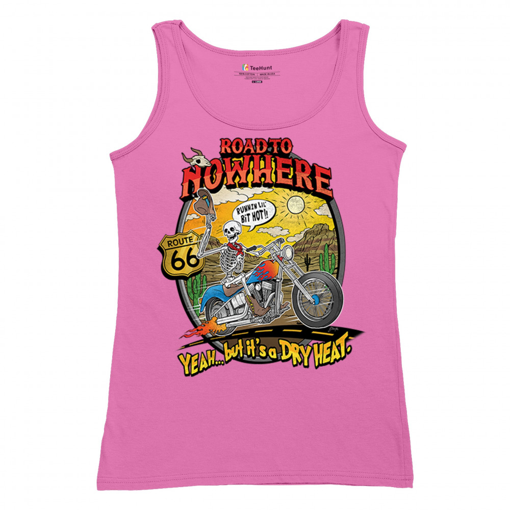 Discover the 'Road to Nowhere' T-shirt: a blend of bold graphics and adventurous spirit. Embrace the ride with our Route 66 skeleton biker design.
