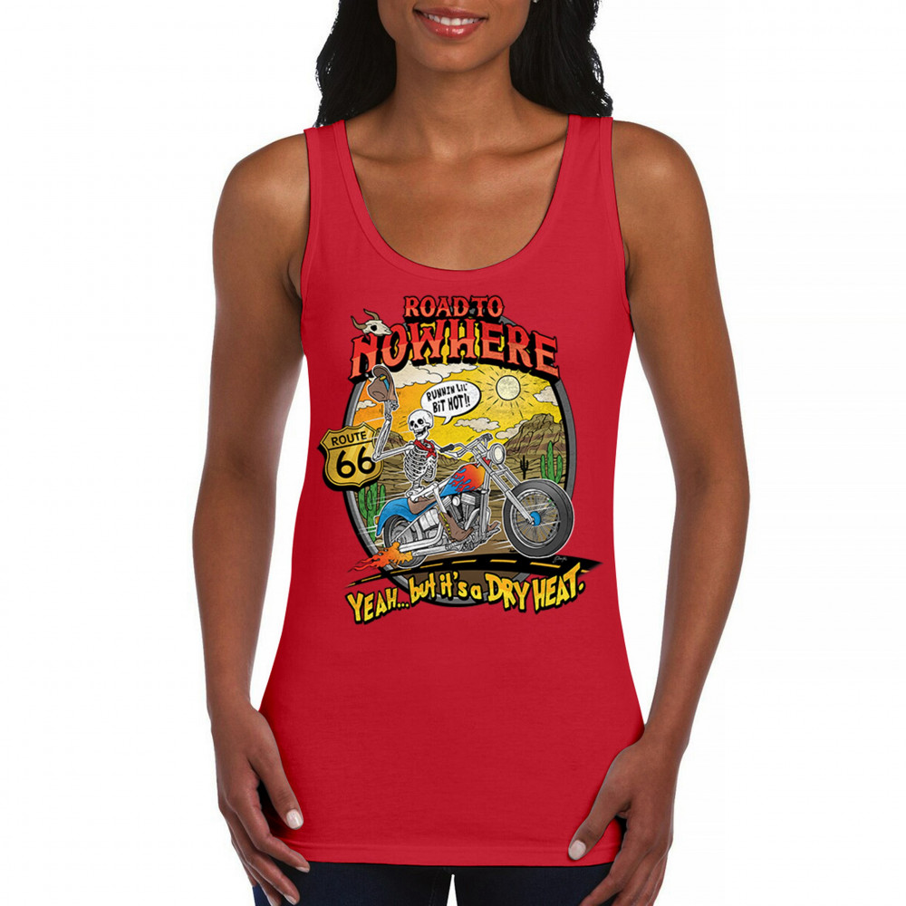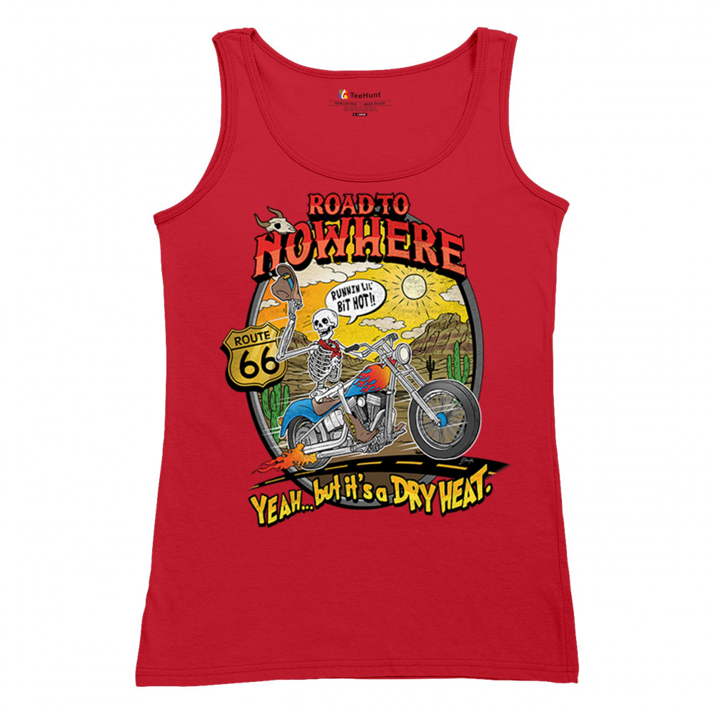 Discover the 'Road to Nowhere' T-shirt: a blend of bold graphics and adventurous spirit. Embrace the ride with our Route 66 skeleton biker design.