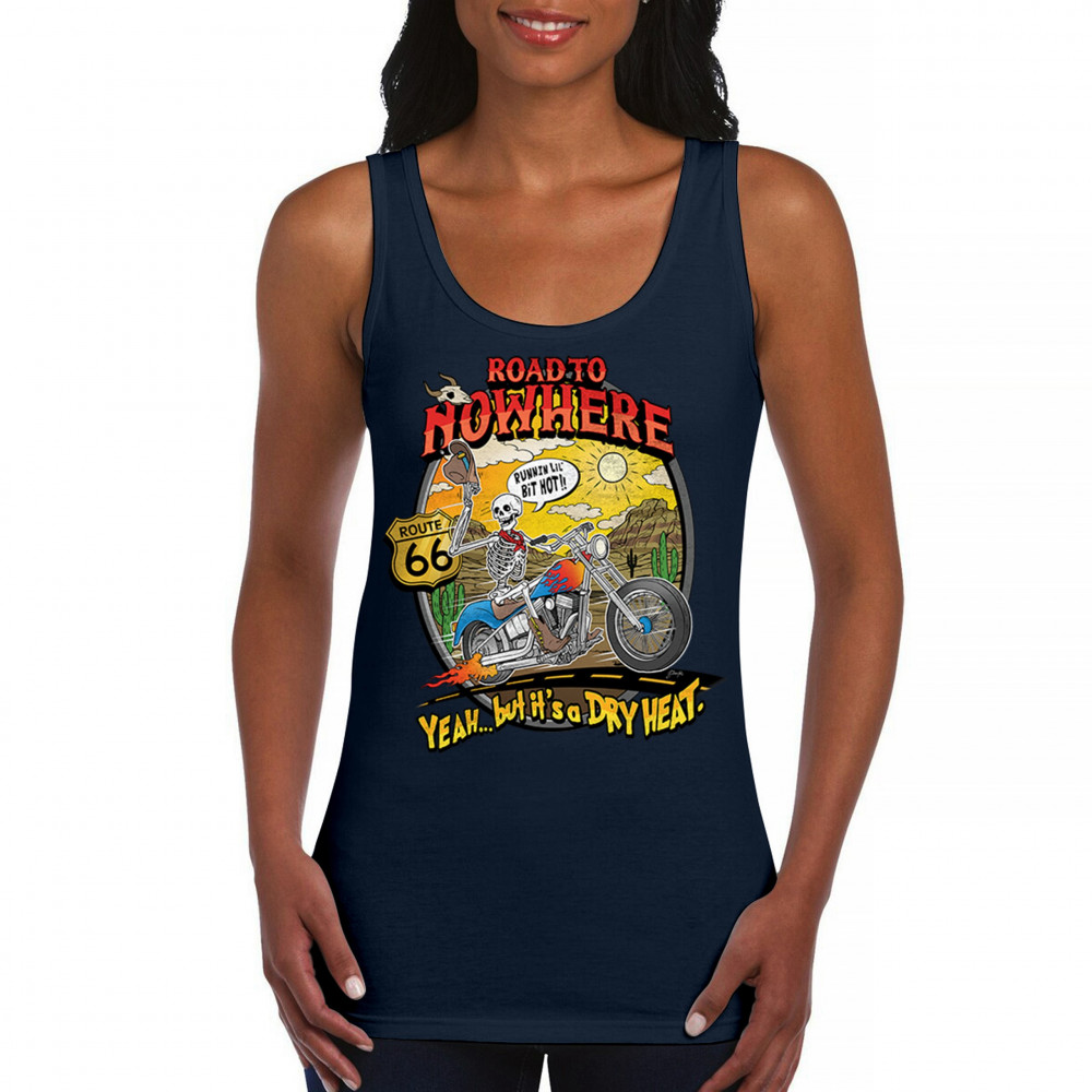 Our 'Road to Nowhere' tee is a salute to the thrill-seekers and the heat-bravers. Adorned with a bold skeleton cruising down Route 66, it embodies the spirit of adventure with a touch of playful defiance. A statement piece for anyone who lives for the ride and laughs in the face of danger. Join the ride into the sunset with this daring design.