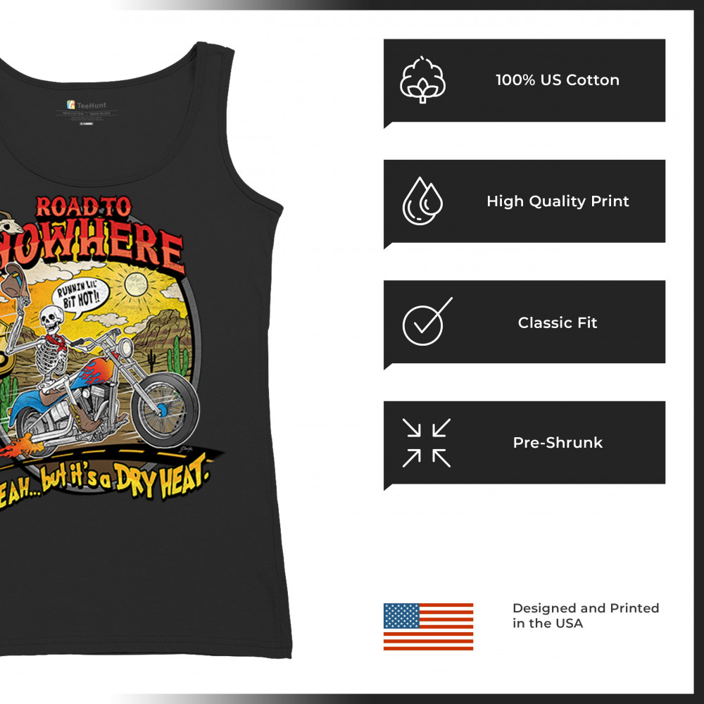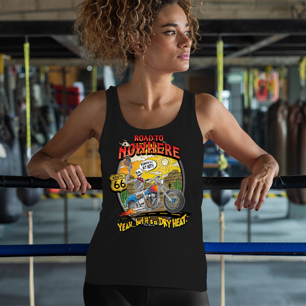 Our 'Road to Nowhere' tee is a salute to the thrill-seekers and the heat-bravers. Adorned with a bold skeleton cruising down Route 66, it embodies the spirit of adventure with a touch of playful defiance. A statement piece for anyone who lives for the ride and laughs in the face of danger. Join the ride into the sunset with this daring design.
