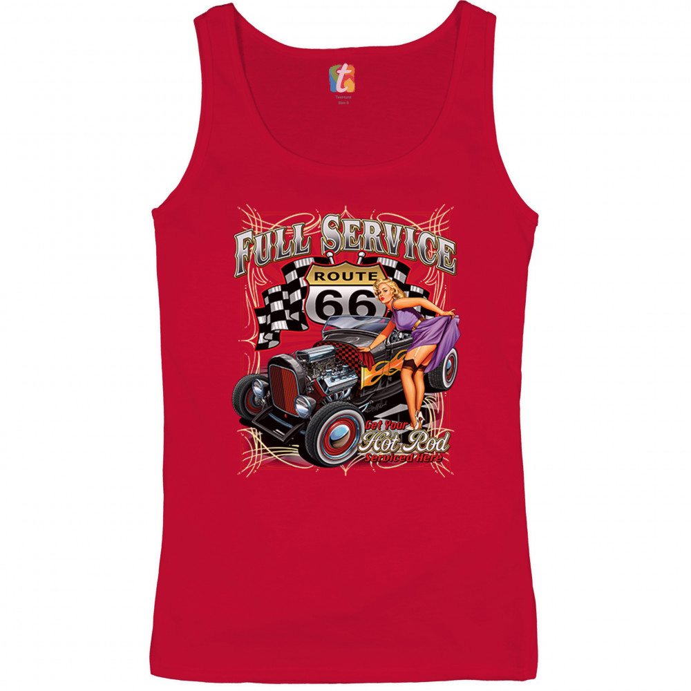 A print featuring a hot rod muscle car with flames painted on it's sides. There is a beautiful pin-up girl in stockings standing near it lifting her dress with one hand. The prints says: "full service" and "get your hot rod serviced here". In the background there is a Route 66 sign with racing flags to it's sides. Great for Route 66 and hot rod fans.