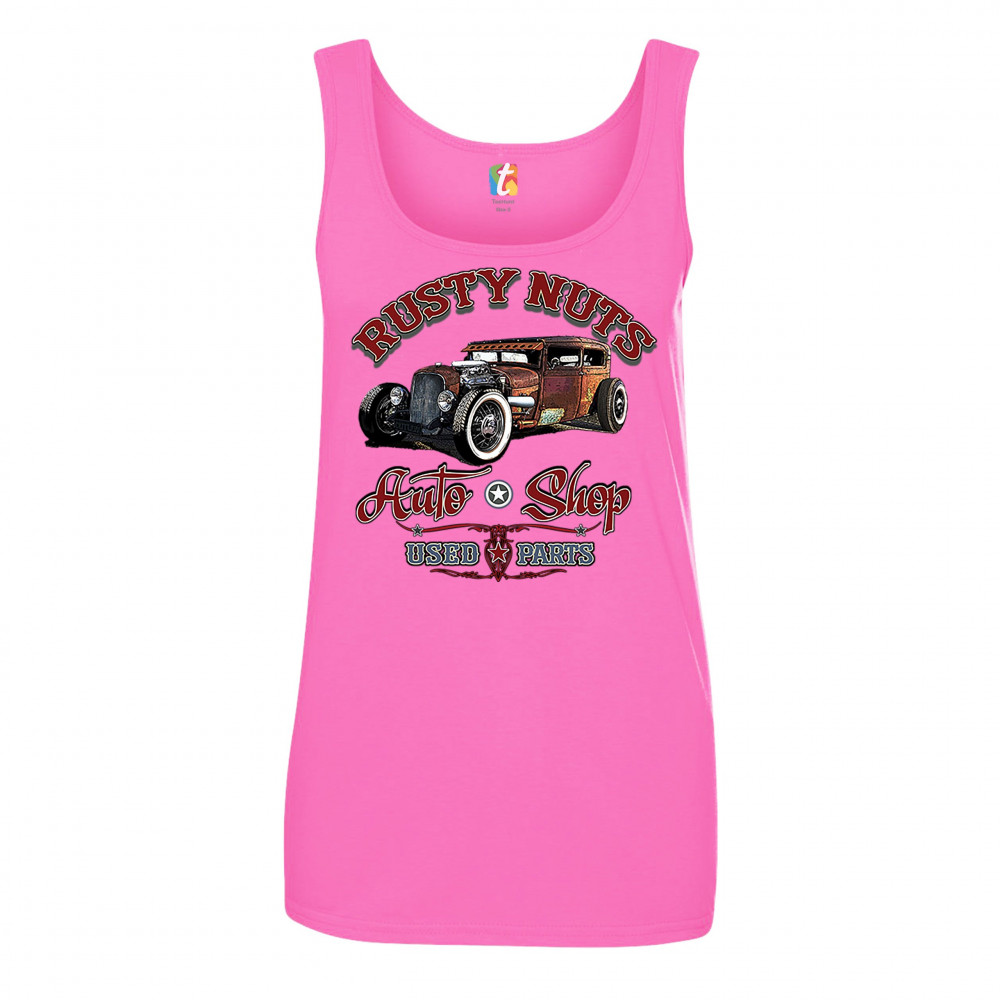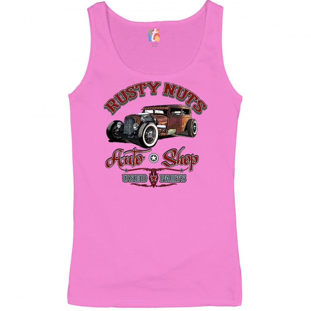 RUSTY NUTS AUTO SHOP women's tank top hot rod rat rod vintage old school pink