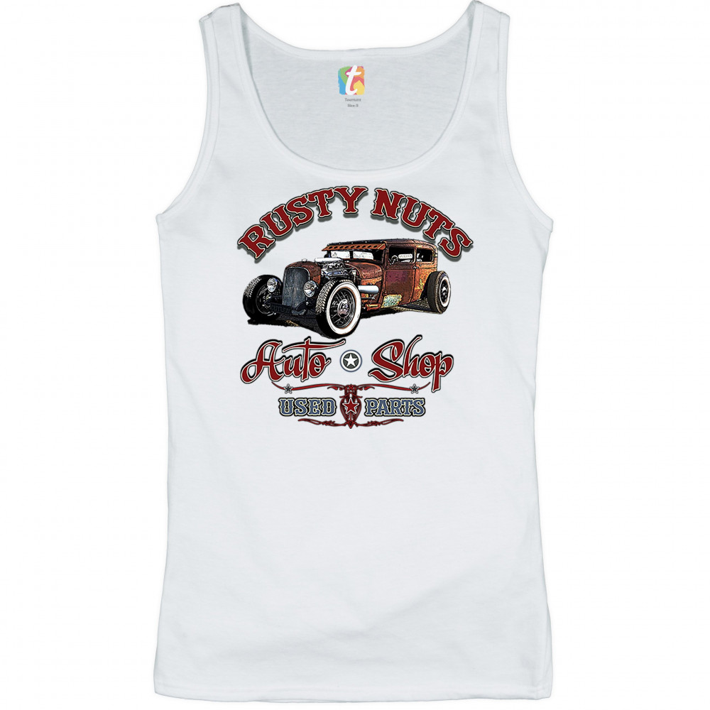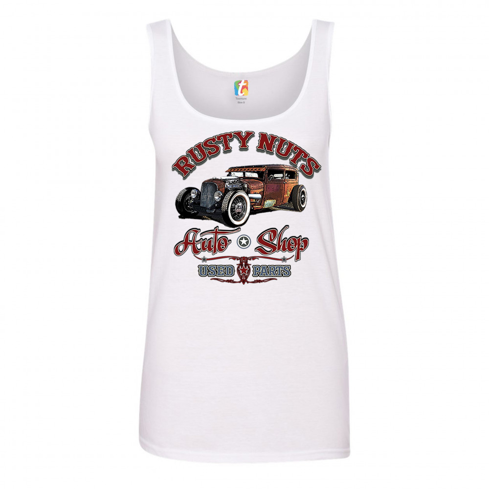 RUSTY NUTS AUTO SHOP women's tank top hot rod rat rod vintage old school white