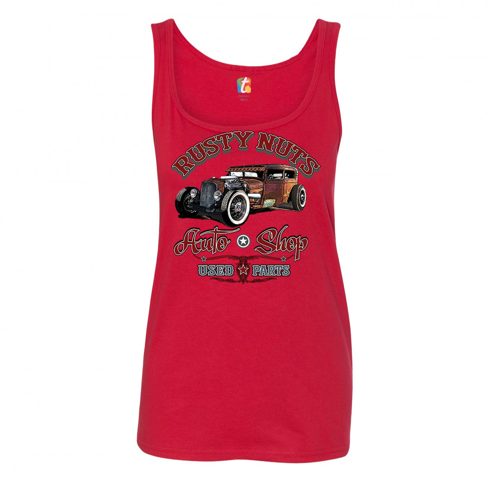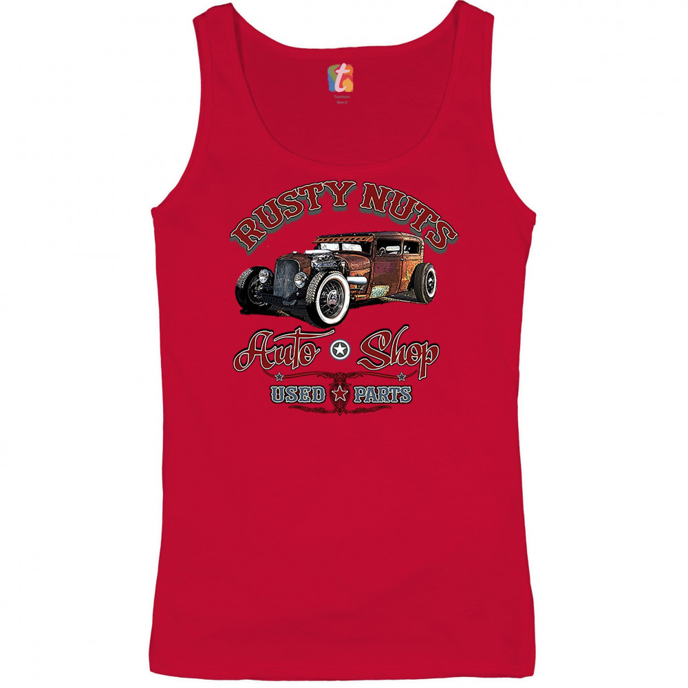 RUSTY NUTS AUTO SHOP women's tank top hot rod rat rod vintage old school red