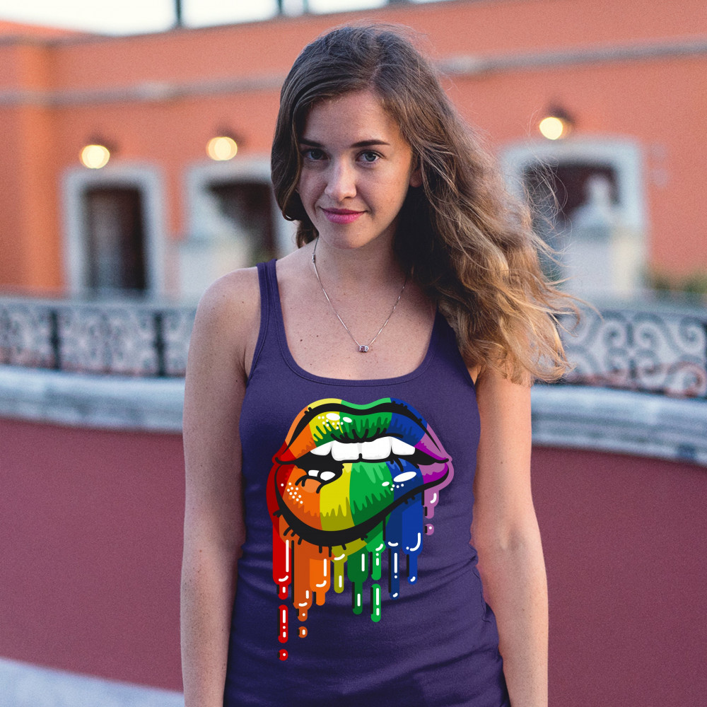 A print featuring sexy biting lips with rainbow lipstick on and rainbow liquid dripping off them. Great choice to wear as a proud queer person.