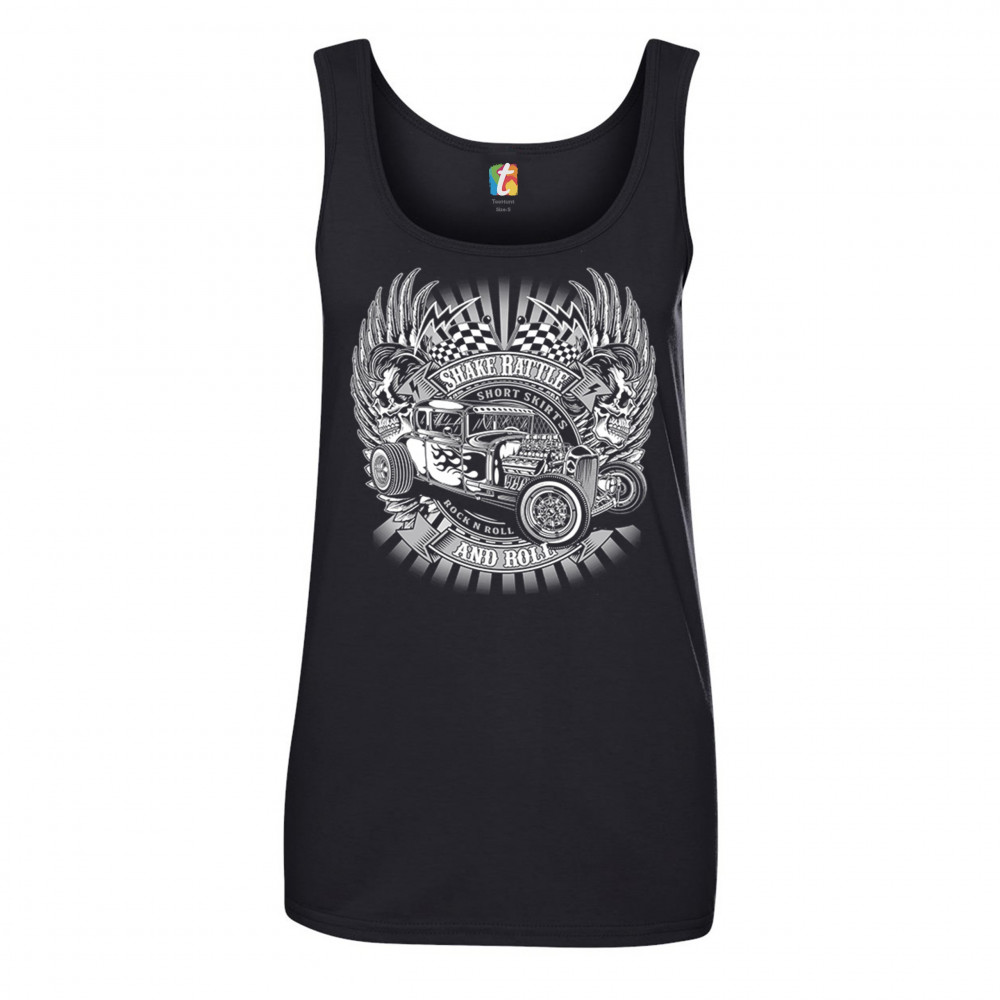 A print featuring a vintage hot rod with an exposed engine, a pair of skulls, wings and racing flags. On several stripes it says: "Shake rattle and roll", "short skirts" and "rock and roll". A great choice for a fan of customized American classic cars and