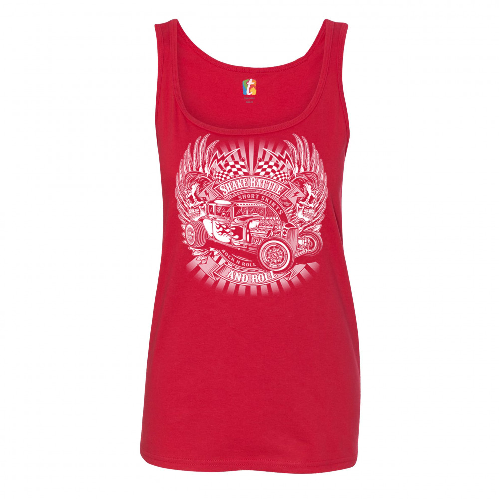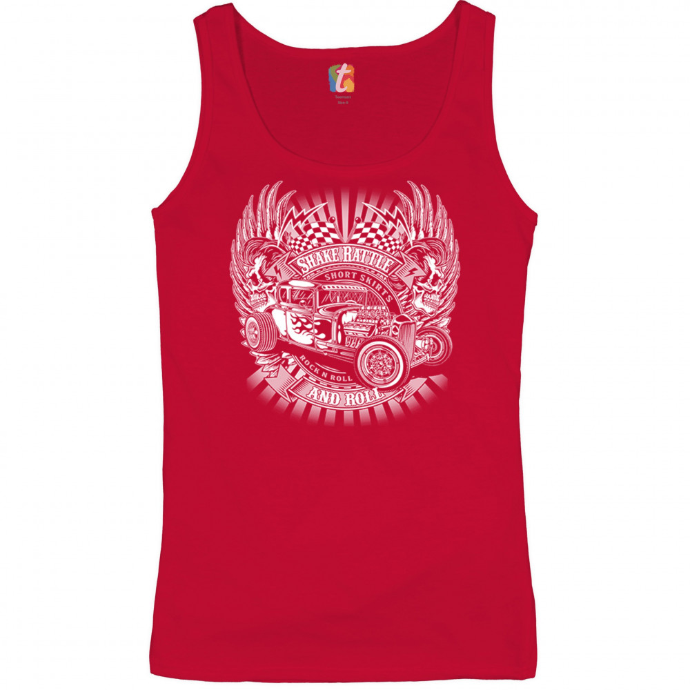 A print featuring a vintage hot rod with an exposed engine, a pair of skulls, wings and racing flags. On several stripes it says: "Shake rattle and roll", "short skirts" and "rock and roll". A great choice for a fan of customized American classic cars and