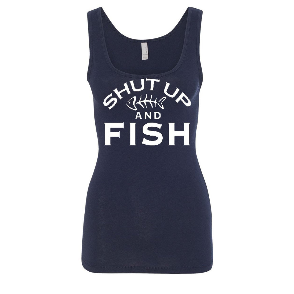 SHUT UP AND FISH women's tank top funny fishing top navy blue