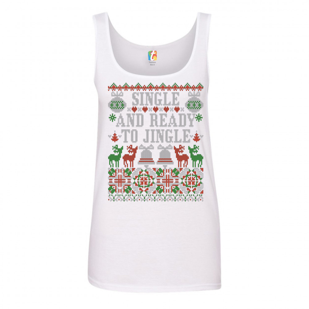A print saying: "Single and Ready to Jingle" and featuring four reindeers and two Christmas bells. The print is designed as an ugly sweater. Amazing choice for a single person who wants to make people smile and spread positive vibes on Christmas Eve.